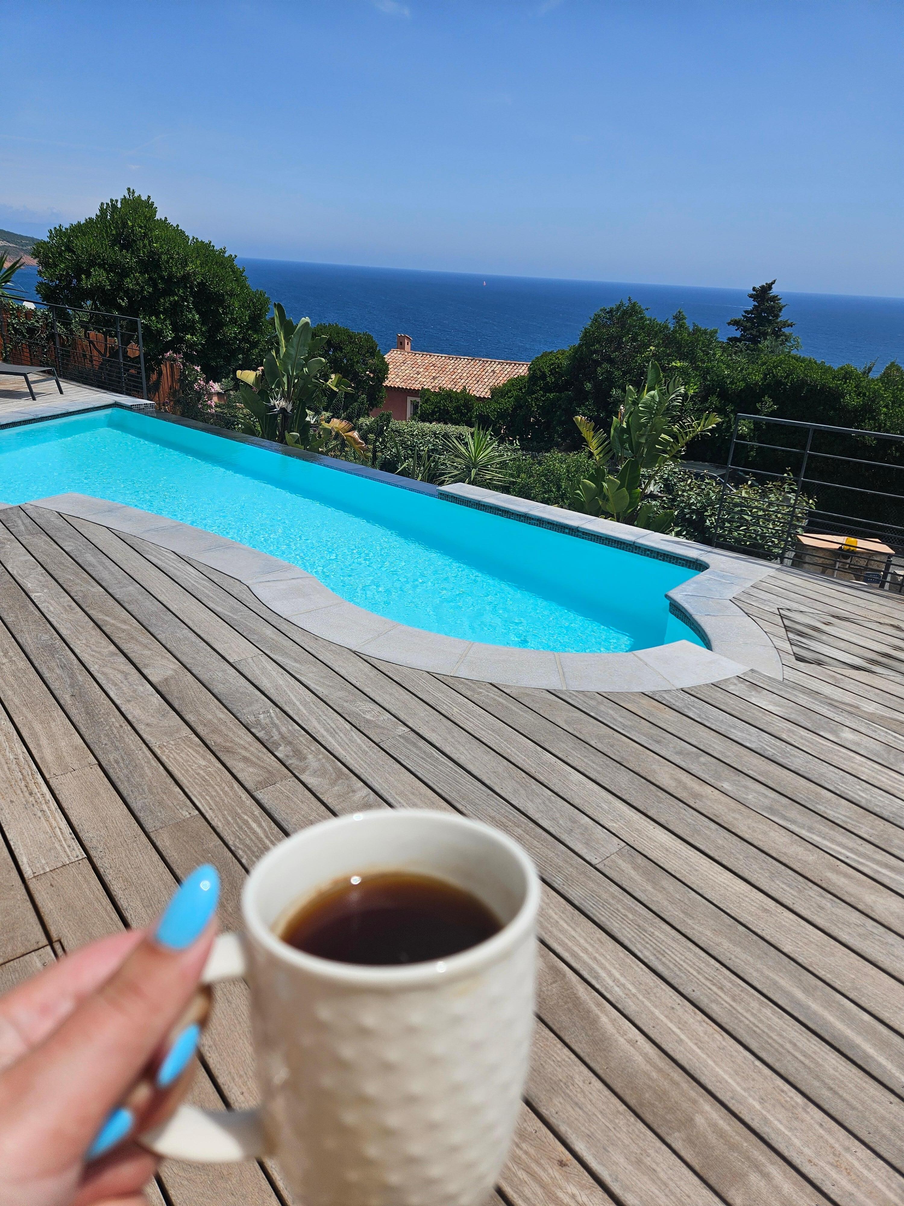 Outside, there are lovely wood-panelled terraces, a lovely free-form swimming pool (with alarm) heated according to the season, and the omnipresent sea view.