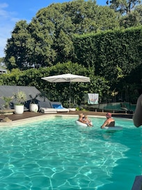 The POOL HOUSE is a completely seperate studio style space, with a small kitchen, living/TV area, open plan bathroom and queen bed.
