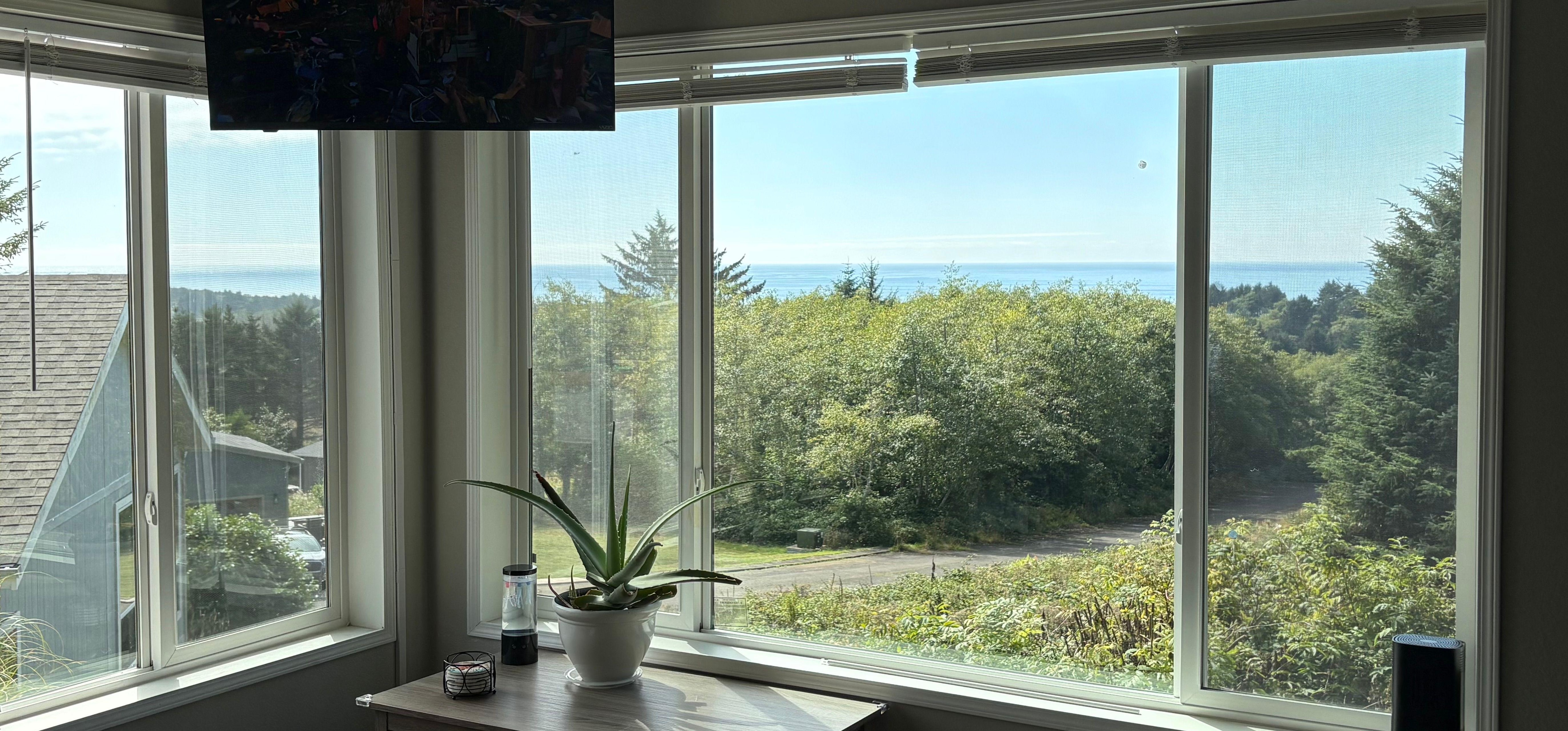 You’ll enjoy quiet, ocean breezes and plenty of open space in DandD By the Sea, a beautiful single-level home on a ridge above the sea near Neskowin. Designed for relaxation, this home features contemporary furnishings, sleek surfaces, and sumptuous bedrooms, making it a wonderful spot to share with another couple or small family. Recliners in the living room look out to rolling foothills with the ocean on the horizon, a frame for gorgeous sunsets and clear morning light. The fully equipped kitchen has an ocean view over the sink, stainless-steel appliances, and sparkling counters ready to support your dinner plans. The pretty queen bedroom features an adjustable bed for optimal comfort and a bath across the hall. The king suite has its TV. Your peaceful spot is conveniently located between the busy activity of Lincoln City and tourist fun in Tillamook, where the Air Museum and Tillamook Creamery make for a great day trip. Neskowin’s sweet village has a restaurant and scenic beaches just five minutes by car, and Pacific City has fine dining, craft brewing and fantastic Haystack Rock and Cape Kiwandan, ten minutes in the other direction. After a day of exploration, you’ll marvel at the sunset as you enjoy a fire in the outdoor fire-pit in your cottage by the sea.