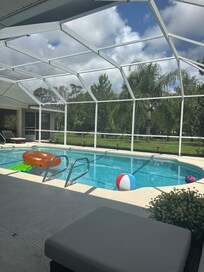 Our 2,100 sq ft home with an additional 1,700 sq. ft. of screened outdoor living space sits on close to a half acre of manicured greenspace with a view of a peaceful fresh water canal. You'll spend every waking moment outdoors enjoying our oversized 15'x30' pool, Eight person hot tub, Seven foot pool table, private fishing dock, 2 outdoor sectionals, outdoor TV, outdoor kitchen and outdoor dining table for 8. You'll also enjoy our competition dart board and abundant board games and puzzles. Our property is like a private nature sanctuary and you'll spot plenty of wildlife including cranes, herons and the occasional deer walking across the lawn at dusk.