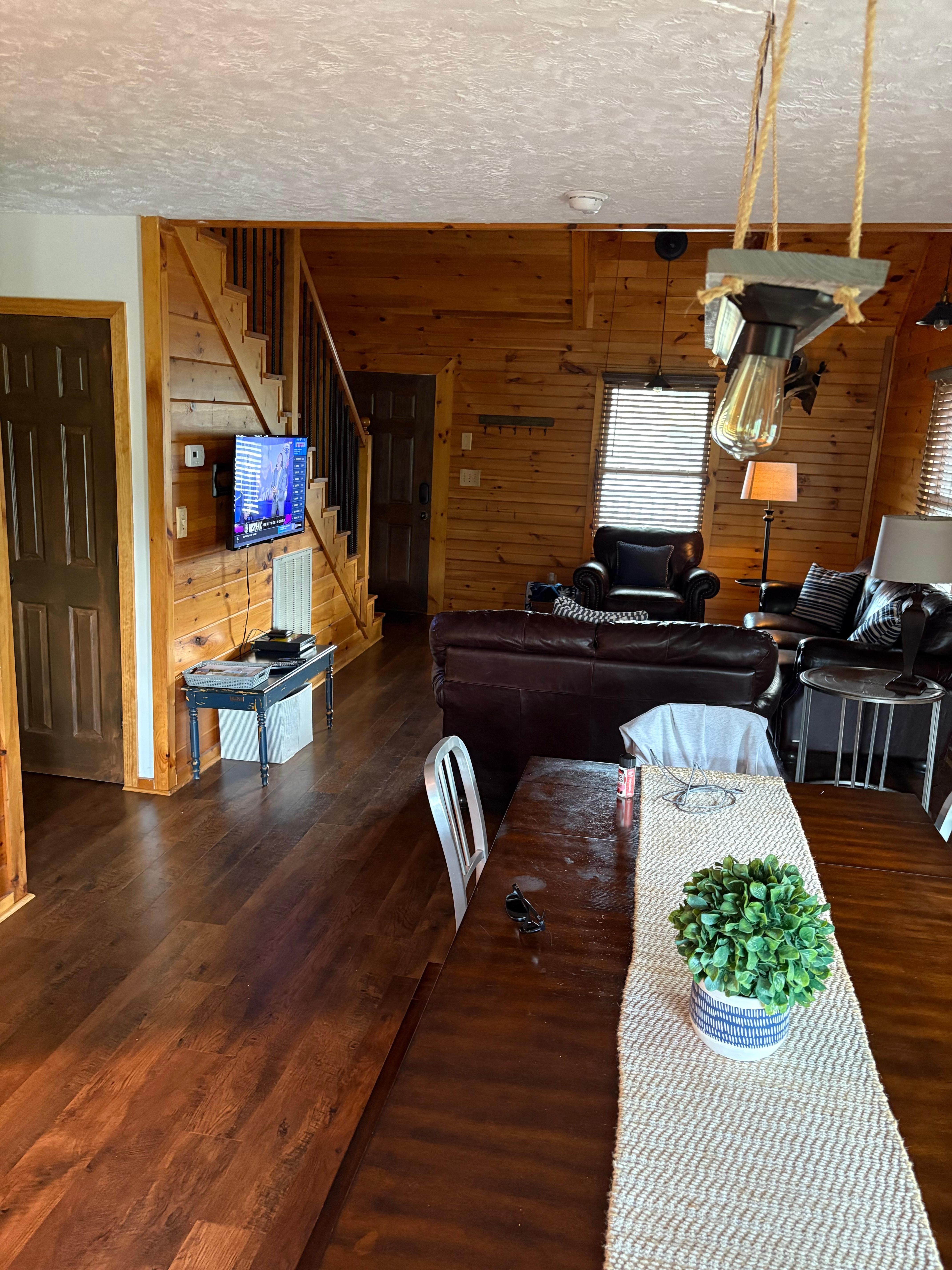 Fish, boat, relax at our Riverview cabin in Gordonsville located on a peaceful 19 acre property overlooking the beautiful Caney Fork River. Our cabin offers solitude, recreation, and rejuvenation to all guests looking for a change of pace. The Riverview cabin offers all the modern conveniences you need with three bedrooms, two baths, Wi-Fi, cable and Roku TV. Downstairs you can relax while watching TV in the living room or playing cards around the dining table. You can overlook the river while preparing a meal in the fully stocked kitchen or while grilling on the back porch. Also downstairs you will find one queen bed with a TV and DVD player and a full bath. Upstairs you will find the second full bathroom, a bedroom with a bunkbed, trundle bed and a TV, and another queen bed in the loft overlooking the river. With a beautiful river view from the back porch, you can enjoy the outdoors from home or escape to one of the many river access points in the area. Only 3 miles off I 40, Riverview cabin is 4 miles from the Gordonsville access ramp to the Caney Fork River and is within 10 miles of Betty’s Island and the Carthage access ramp. A five minute car ride will take you into town where you will find restaurants and shopping. A 25 minute car ride will take you to the Southern Hills golf course in Baxter. At the Riverview cabin you can begin the day in the front porch rocking chairs overlooking the field or on the back porch swing watching kayakers float down stream. You can also end your fun filled day telling tall tales around the campfire. Whether you are looking for fishing, boating or relaxing, Riverview Cabin offers adventures for all ages.