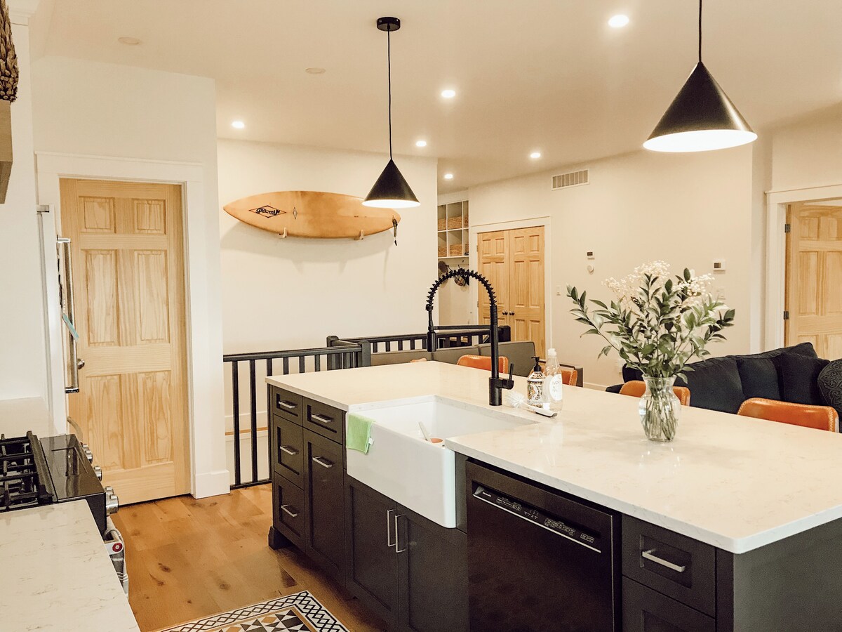 Lane's End Southampton also features a media room with card table, bar with sink and built in fridge. The 65 inch smart TV! The main floor features an open concept living space with oversized breakfast bar, dining table and relaxing sitting area with gas fireplace. The outdoor space includes a Scandinavian style fire pit and warm water outdoor shower for rinsing off after the beach! The picnic table is a great spot for outdoor dining and the covered porch is the perfect place to relax at the end of the day! The lovely kitchen is a chefs dream including a KitchenAid gas range, dishwasher and fridge with filtered water and ice maker. Our kitchen includes everything you would need to prepare a family meal. If you don’t feel like cooking on holiday there are many wonderful restaurants a short walk away!