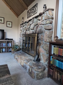 Inside, a stone fireplace and wood stove create a cozy vibe, while a spiral staircase and high ceilings add a sophisticated lodge-like style. Unwind into vacation mode and stream shows on the TV, equipped with Roku. When you're ready to eat, whip up delicious home-cooked meals in the well-equipped kitchen (dishwasher not included).