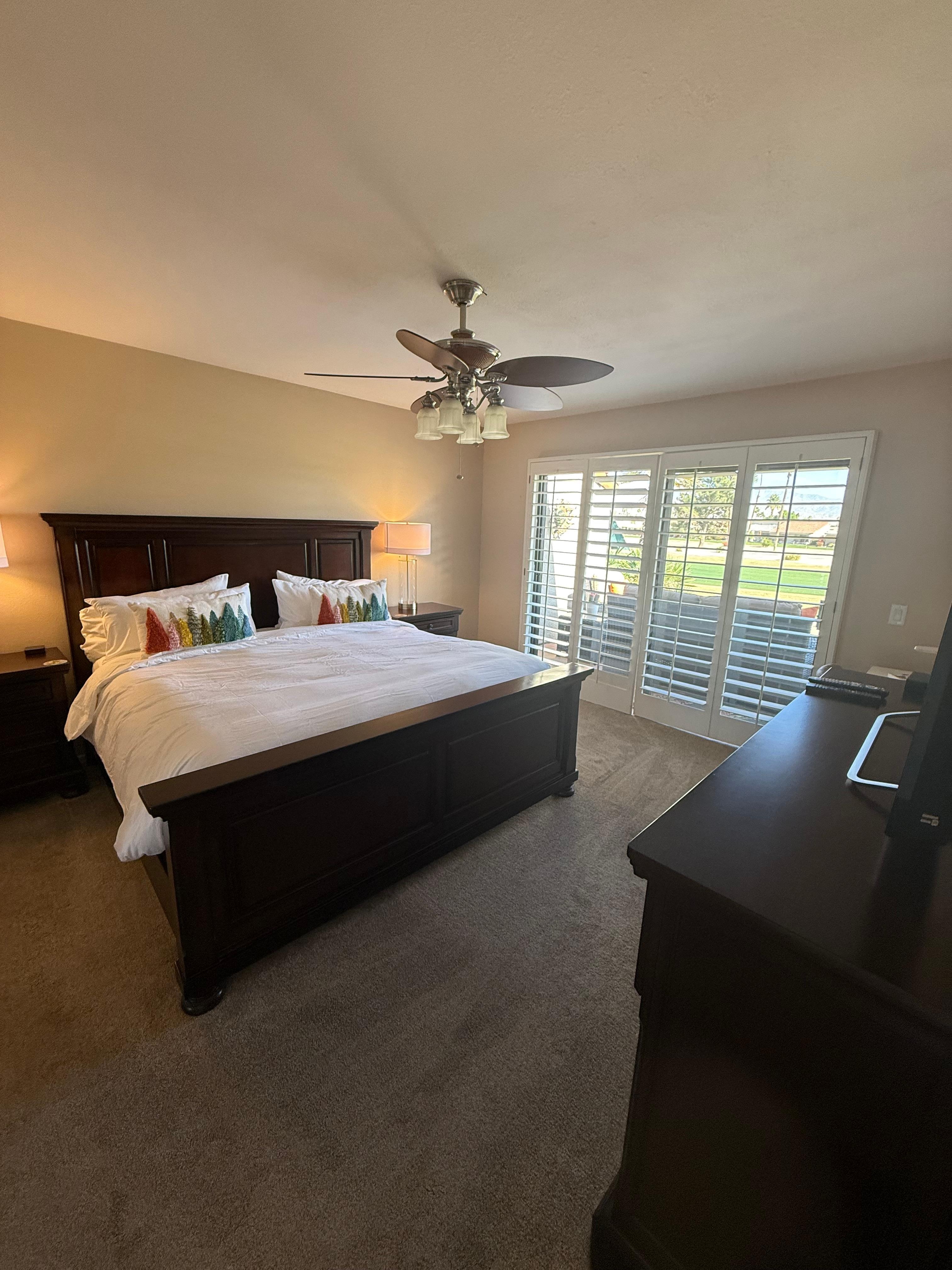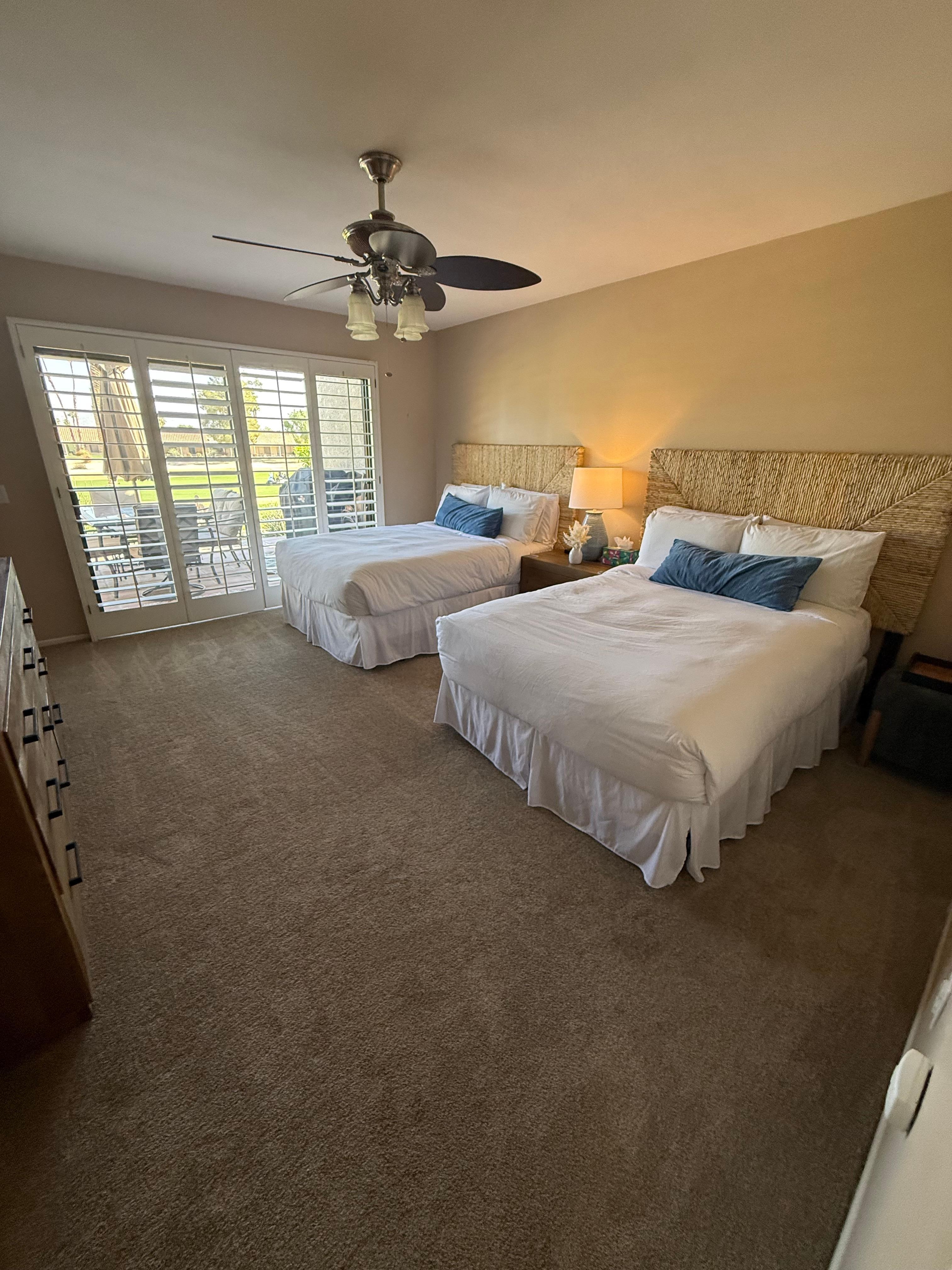 The primary bedroom is thoughtfully positioned on one side of the condo, offering separation and a sense of retreat from the guest space. It features a king bed framed by two nightstands and lamps, soft carpeting underfoot, and a ceiling fan that enhances comfort year-round. A dedicated work area with a desk and printer makes the room well-suited for extended stays or light remote work. Sliding glass doors open directly to the patio, bringing in natural light and reinforcing the home’s easy indoor–outdoor rhythm. The ensuite bathroom includes a tiled walk-in shower and a clean, well-proportioned layout designed for everyday ease. Across the condo, the guest bedroom offers two full beds with a nightstand and lamp, along with a ceiling fan to maintain a comfortable environment. Sliding glass doors open to the patio, with golf course views. The guest bathroom features a tiled walk-in shower, continuing the home’s consistent and practical design language.