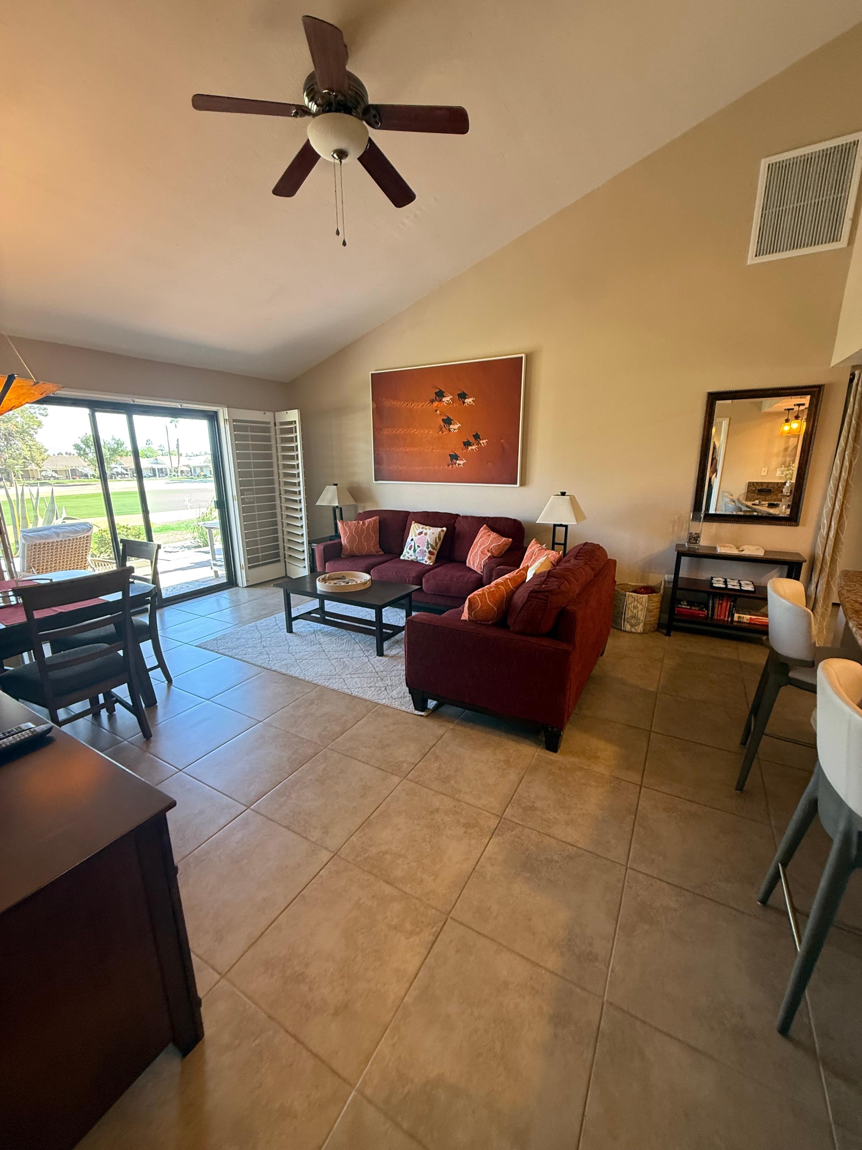 The interior unfolds into a bright, open living space where tile flooring extends throughout, creating an easy flow from room to room that supports everyday living. Vaulted ceilings crown the living and dining areas, creating a sense of volume that feels airy while remaining calm and welcoming. Plush furnishings anchor the living room, arranged to encourage relaxed conversation and evenings spent unwinding in front of the TV. Natural light moves easily through the space, reinforcing a comfortable atmosphere that never feels overstated. The dining area sits seamlessly within the open floor plan, centered around a table for four and positioned directly in front of sliding glass doors that lead to the patio. This placement keeps the mountain views visually present and allows meals to unfold with a natural connection to the outdoors. The kitchen opens directly to the dining space and is finished with stainless steel appliances, granite counters, and a matching granite backsplash. Its layout balances function and flow, offering generous workspace while remaining connected to the rest of the home, making it equally suited to quiet mornings and shared dinners.