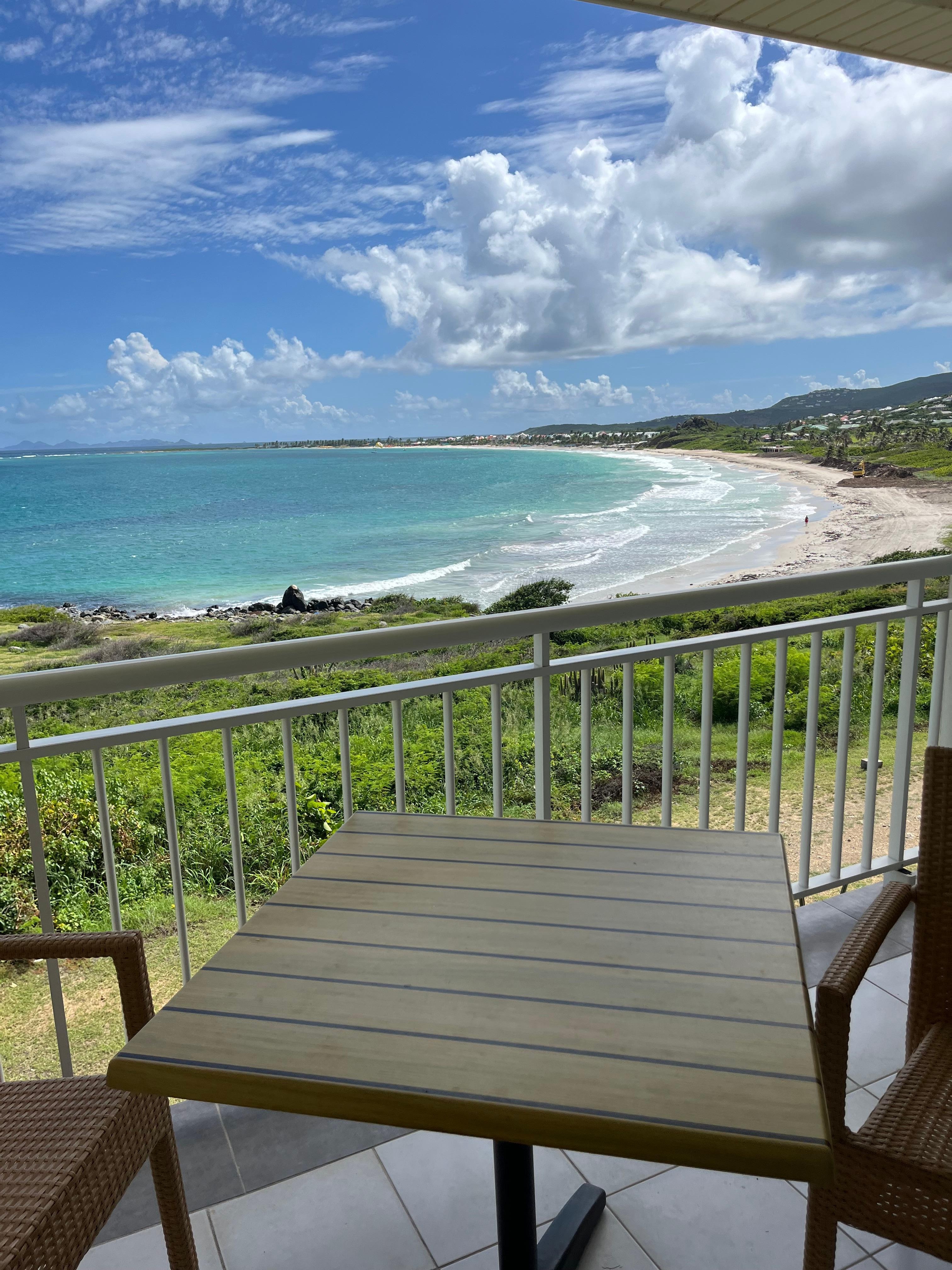 Orient Bay is easily viewed from the entire unit including when waking up each morning and seeing the waves while lying in bed. Walking to the beach is easy, especially from the exceptionally beautiful pool. Minimal parking and a big hill to walk up and down each day to get to and from your car. Pros: Caribbean views Spacious Comfortable couch Responsive landlord On-site convenience store and Pizzeria Cons: Lack of parking Steep hill Rough towels Very firm mattress The people who work at the small store and the on-site pizzeria were friendly and helpful. The landlord quickly responded to a question about the TV and A/C. He also promised to drop by and replace a remote control and cable box, which he did within 30 minutes. Easy to reach him via WhatsApp and he answered questions fast. The unit was as promised with a king-sized bed, a small refrigerator, a cook-top and microwave, kitchen sink, and clothes washer/dryer. Everything was in perfect working order. This was a studio but was spacious and included a writing desk and living room couch and coffee table. Ample closet space was provided although a few more clothes hangars would be recommended. The bathroom was a good size with all of the necessary fixtures. Water pressure was low but adequate for cleaning up daily. The towels provided were a bit rough and only two of each were available. He also provided beach chairs, a cooler to take cold drinks to the beach, and beach towels.