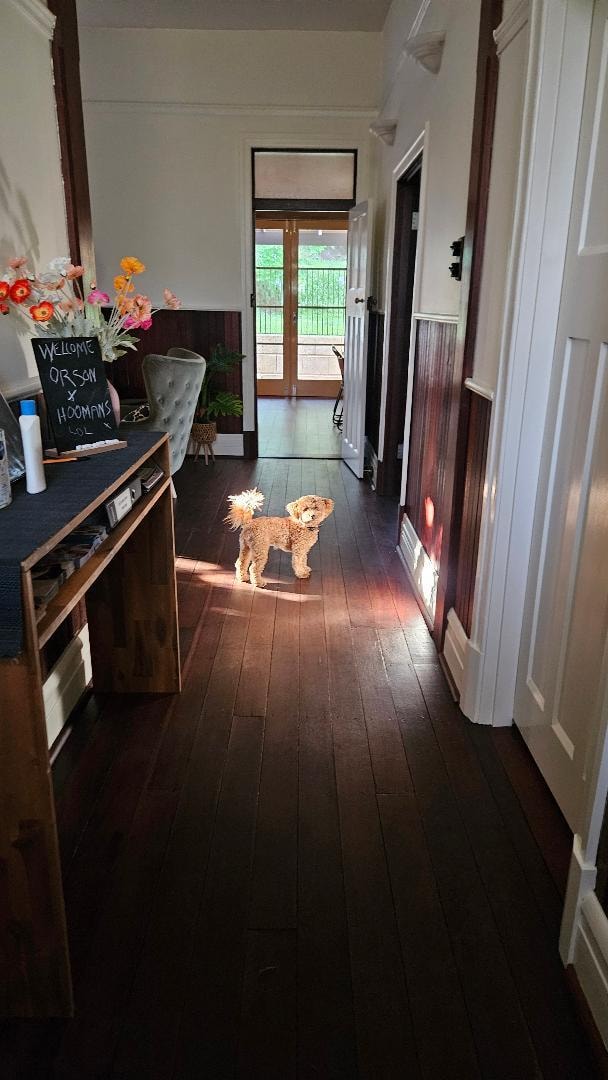 Inside, there’s a wide hallway with soaring ceilings (great for echoey barks), light-filled bedrooms, a cosy reading room, and even a theatre room for movie nights. French doors lead out to the verandah where you can watch the world (or birds) go by.