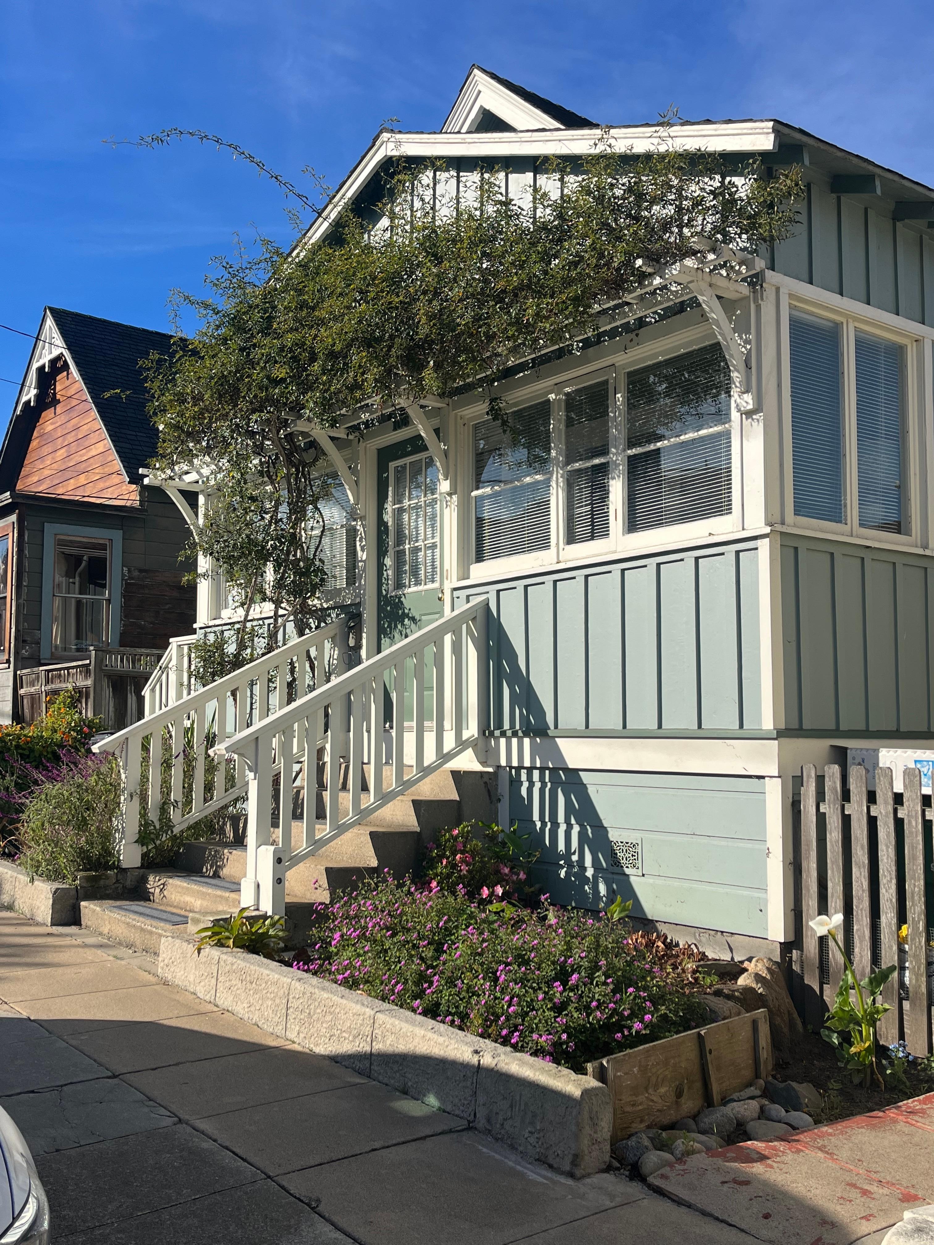 The cottage has 7 steps from the curb to the front door and a slight, 4" rise from the sun room into the living room. The glass-enclosed, shower over tub has one grab bar. Our Pacific Grove License is 0020.