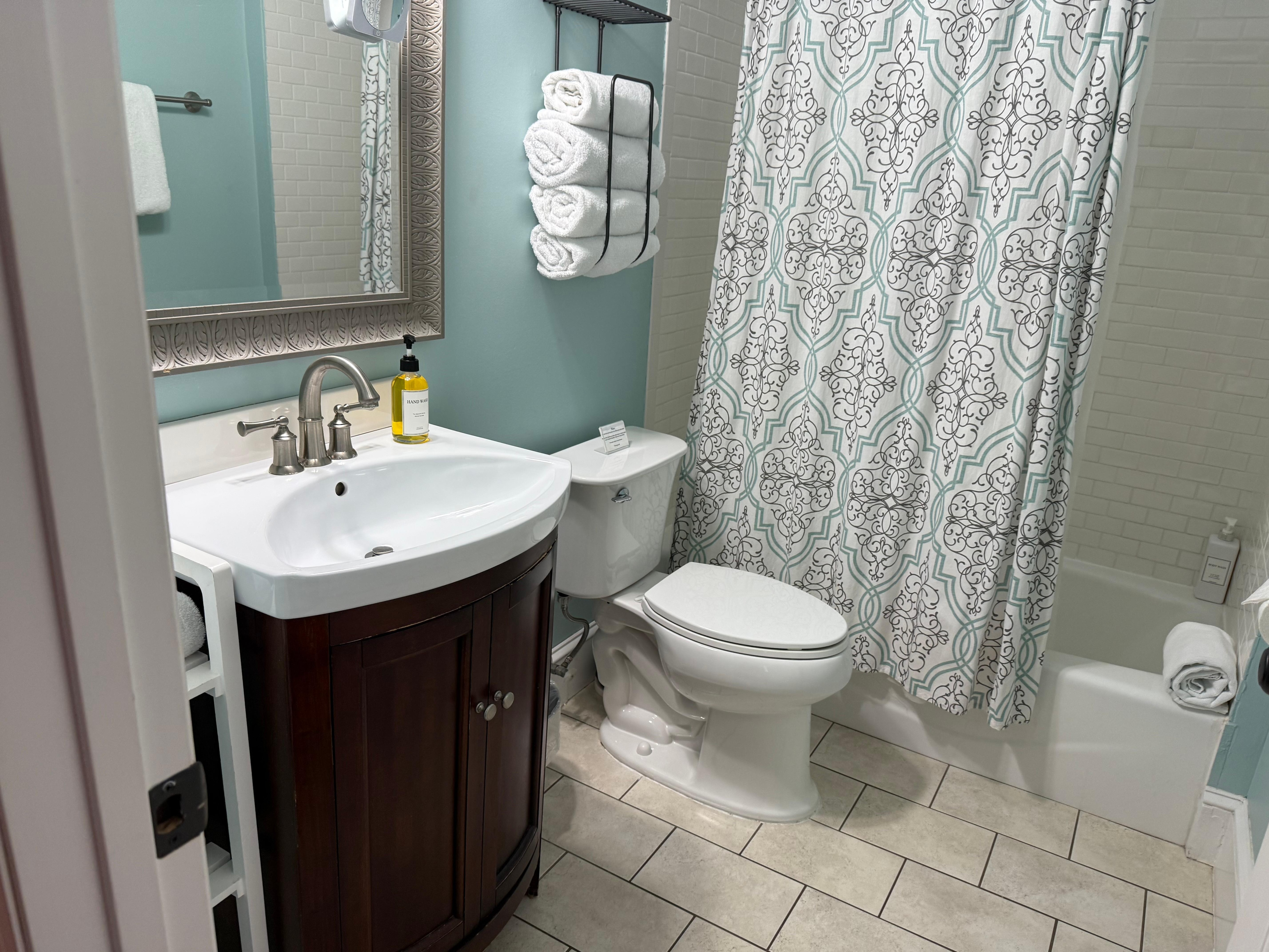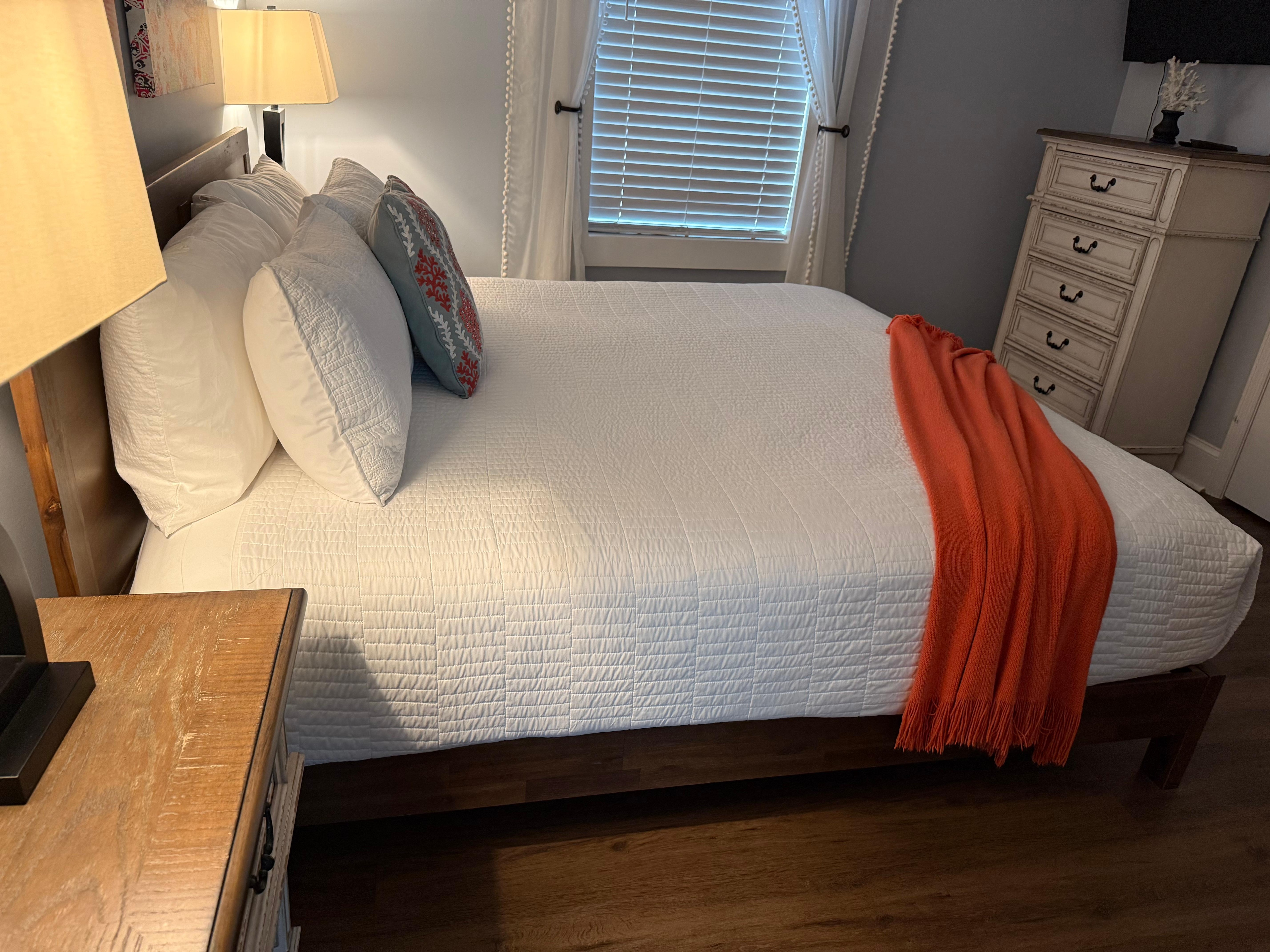 Master Bedroom: King size bed, walk in closet, Smart TV with cable + en-suite bathroom with shower/tub combo.