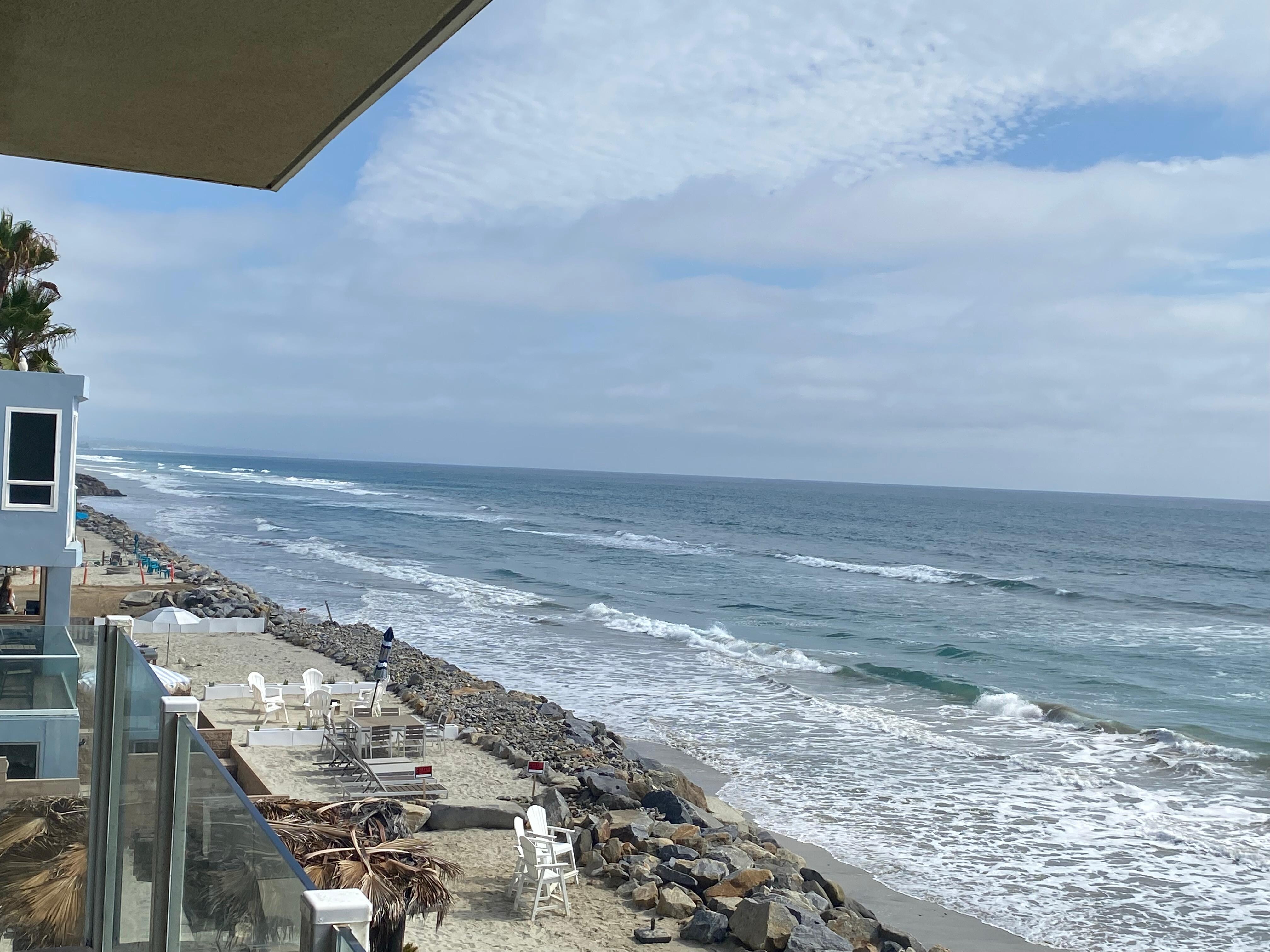 All homes in Oceanside, CA sit behind a rock barrier protecting the homes from storm surges. The amount of sand beyond the rock barrier varies quickly with storms and tides and may have more or less sand than what is shown in the photos.