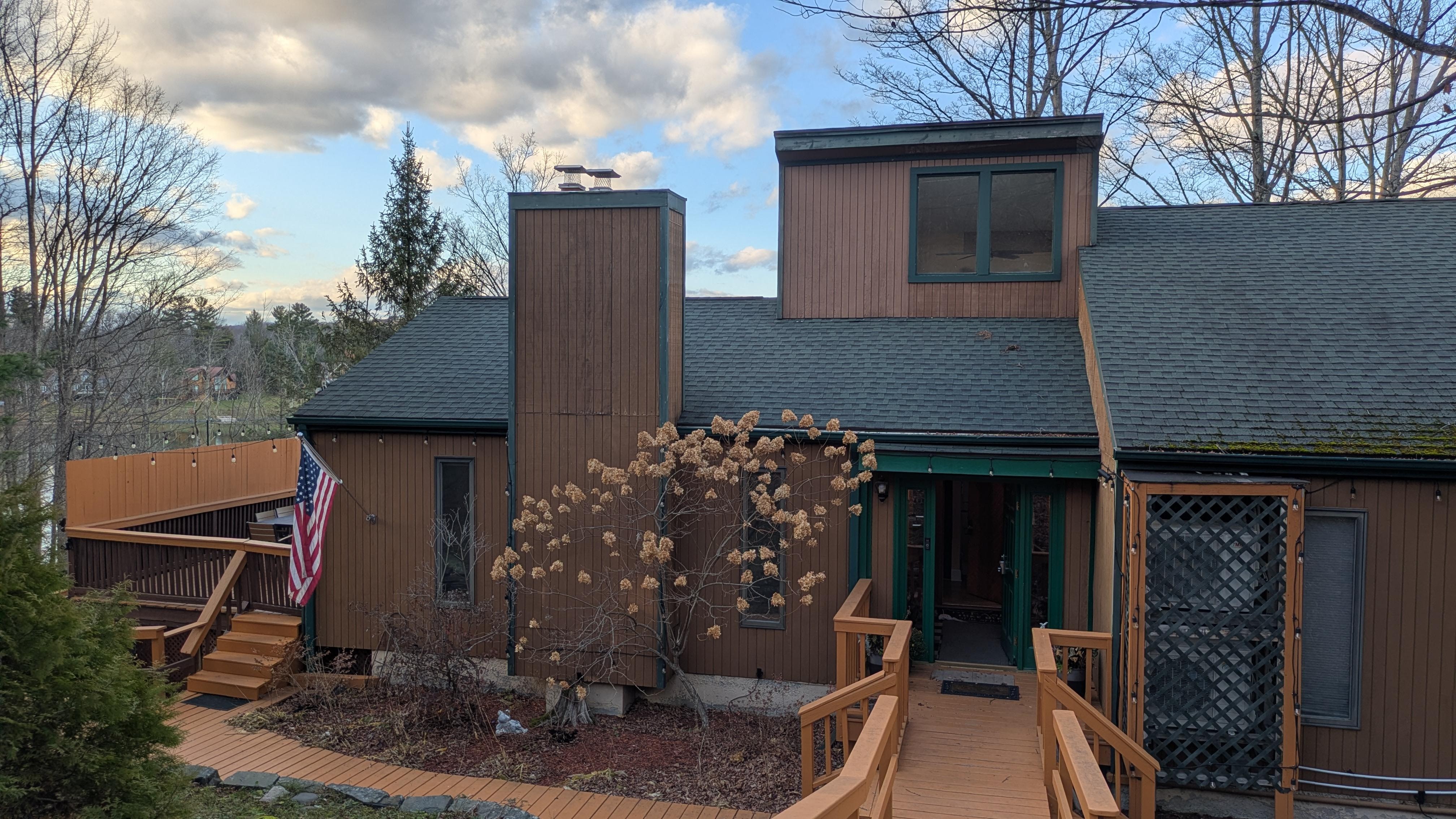 • Great room & dining area include high vaulted ceilings, wrap around lakeside deck, fireplace & modern music/New TV entertainment system