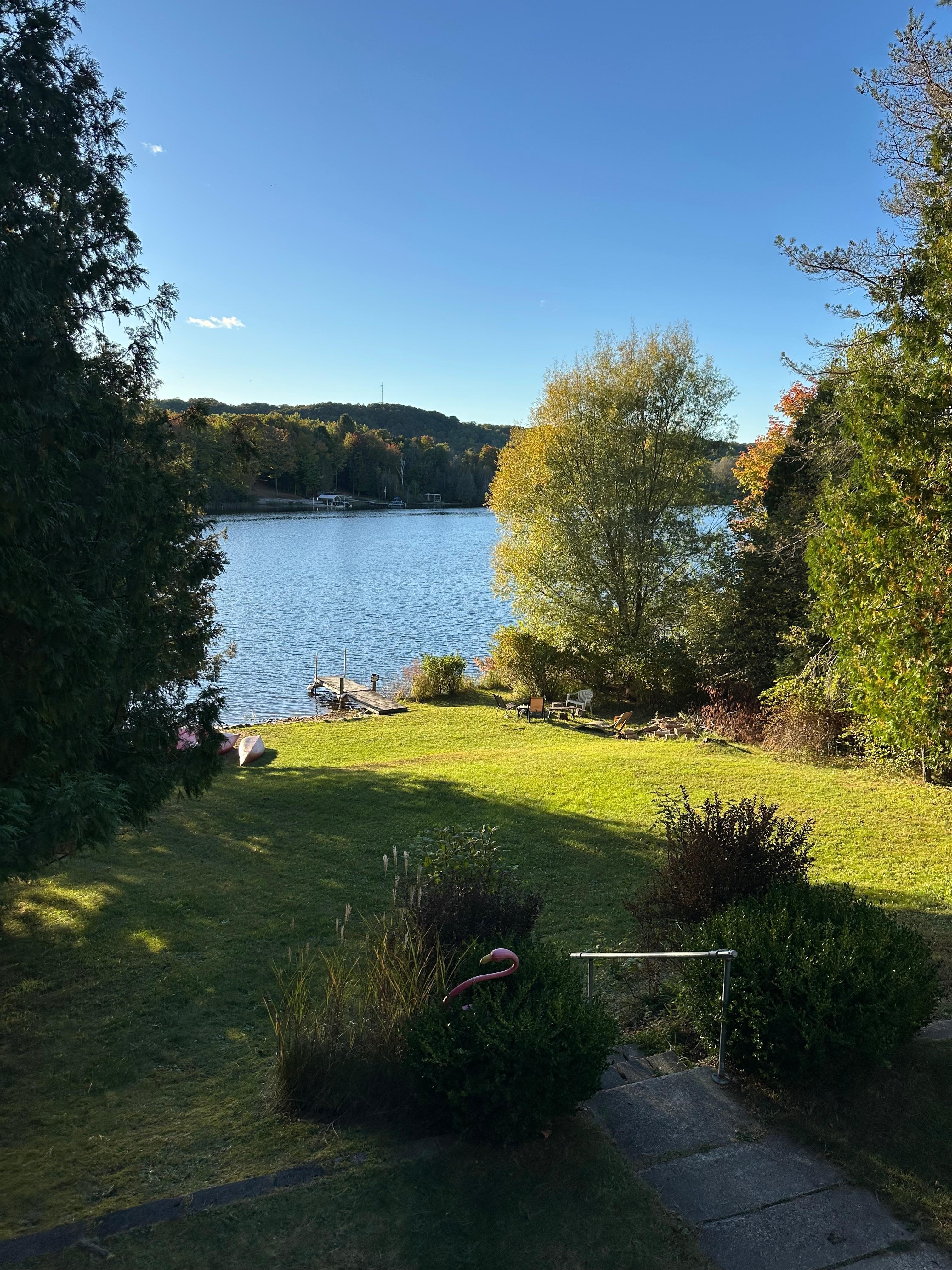 In the master bedroom, enjoy a queen bed with an antique headboard, new mattress (flannel sheets and down comforter in winter) while looking out at the lake through sliding glass doors. In the second bedroom: two solid wood twin over full bunk beds (flannel and down there too). Both rooms have flat-screen TVs and CD players for our collection of many dozens of movies. Enjoy our completely updated bathroom.