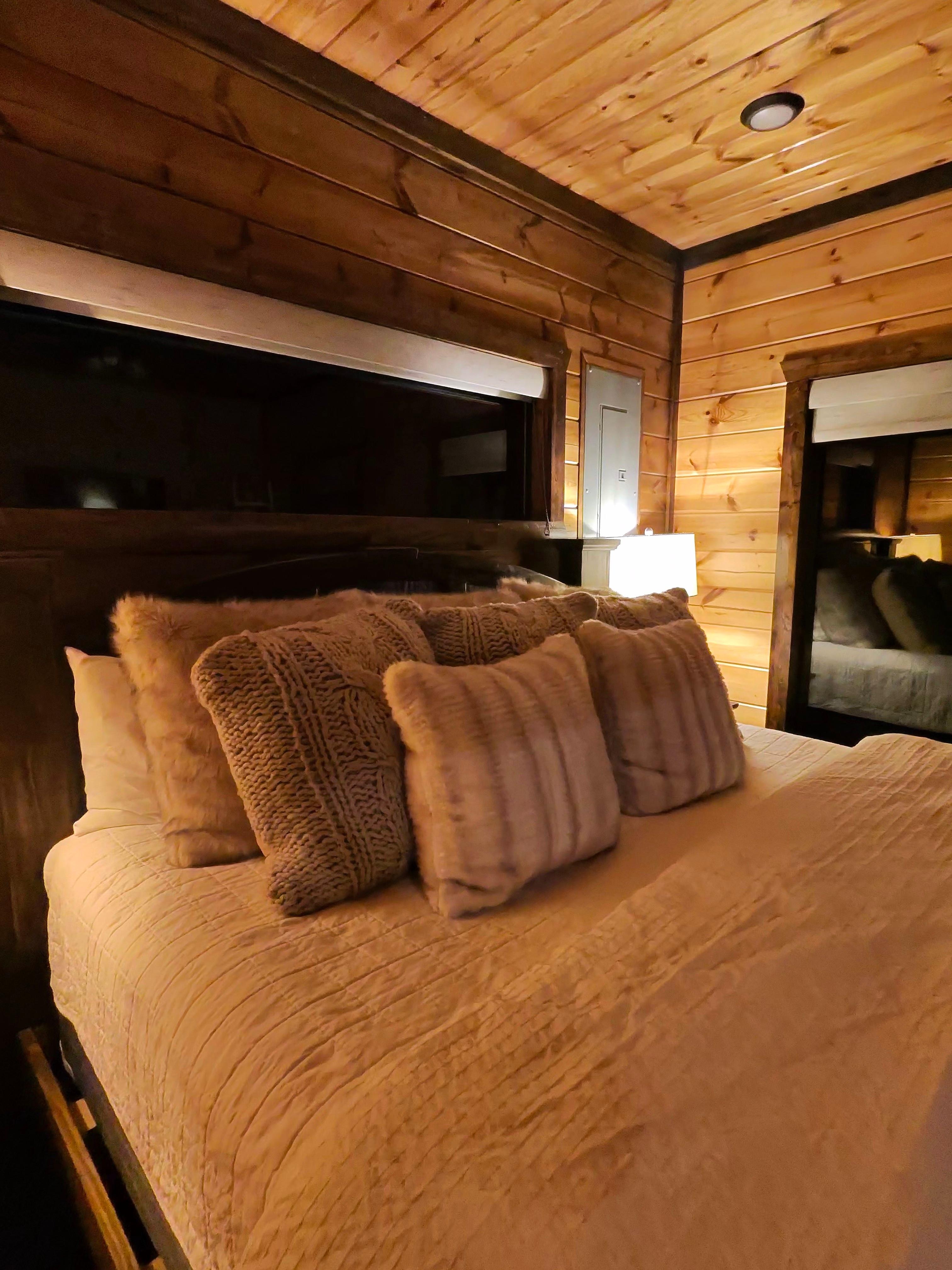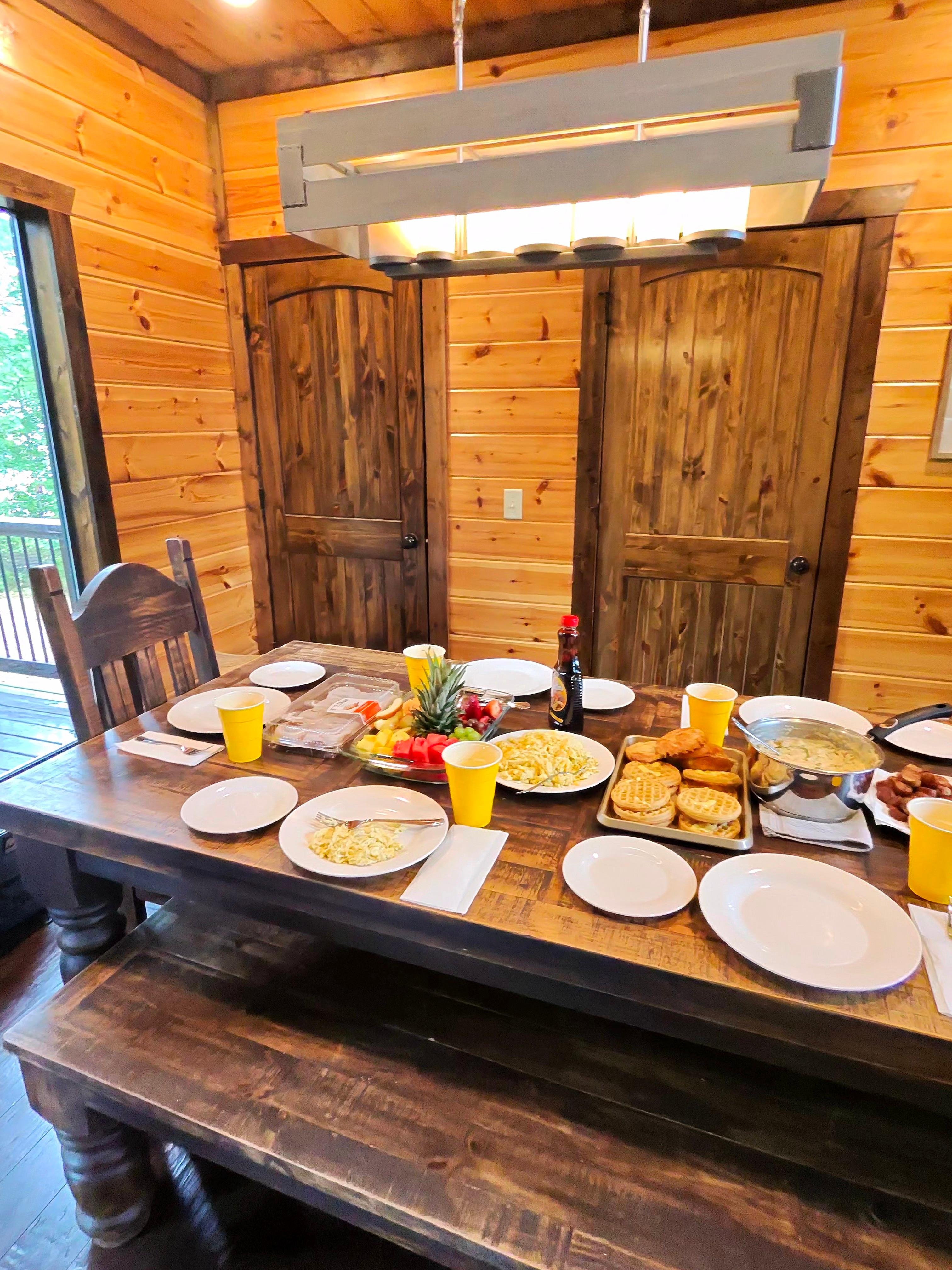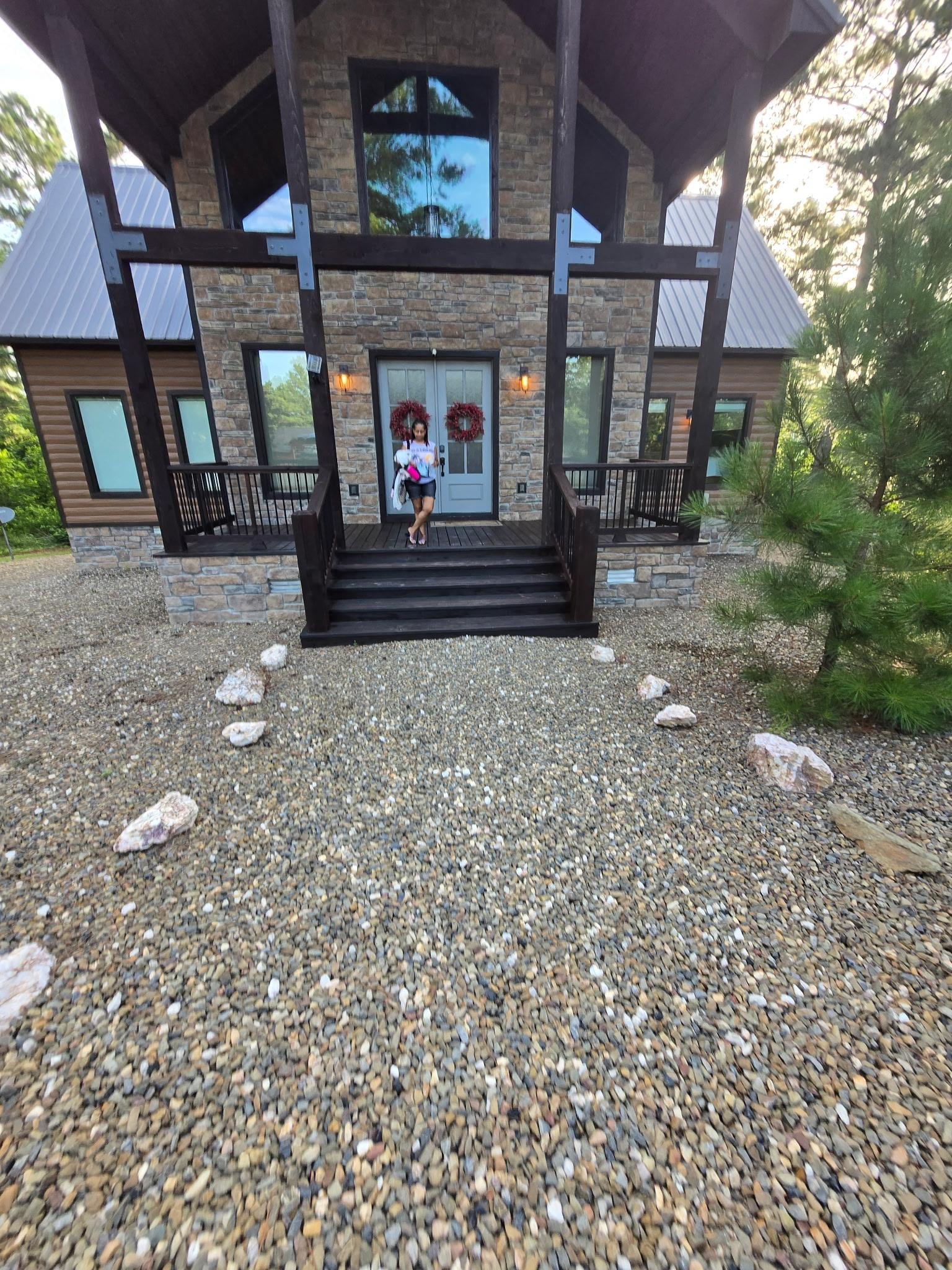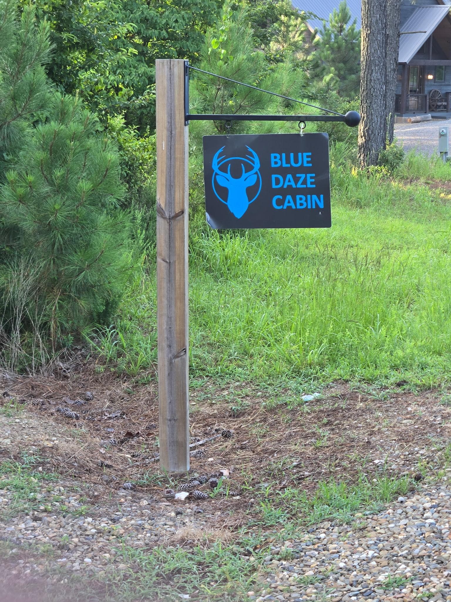 Blue Daze is a beautiful luxury cabin located in the Eagle Mountain area of Broken Bow/ Hochatown, Oklahoma. This cabin offers 4 bedrooms with their own private bathroom (4 bathrooms), large den area with a fireplace, kitchen, patio area with a fireplace and dining table ( max occupancy of 8). Outdoors, the hot tub sits in a covered gazebo for your enjoyment. On the grounds, there are games of corn hole, horseshoes and ladder toss. To round out your evening there is a wood burning fire pit where you can roast hotdogs and marshmallows under the stars.