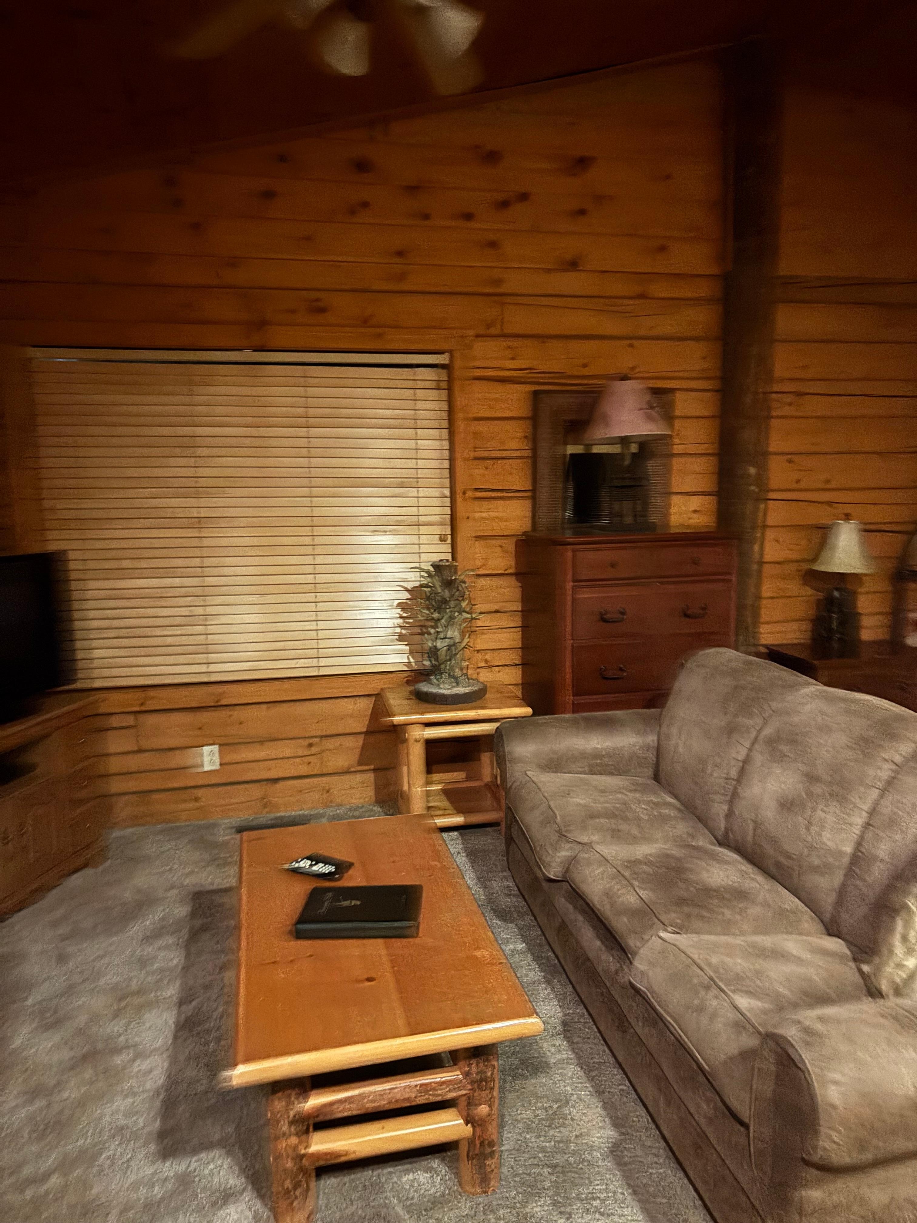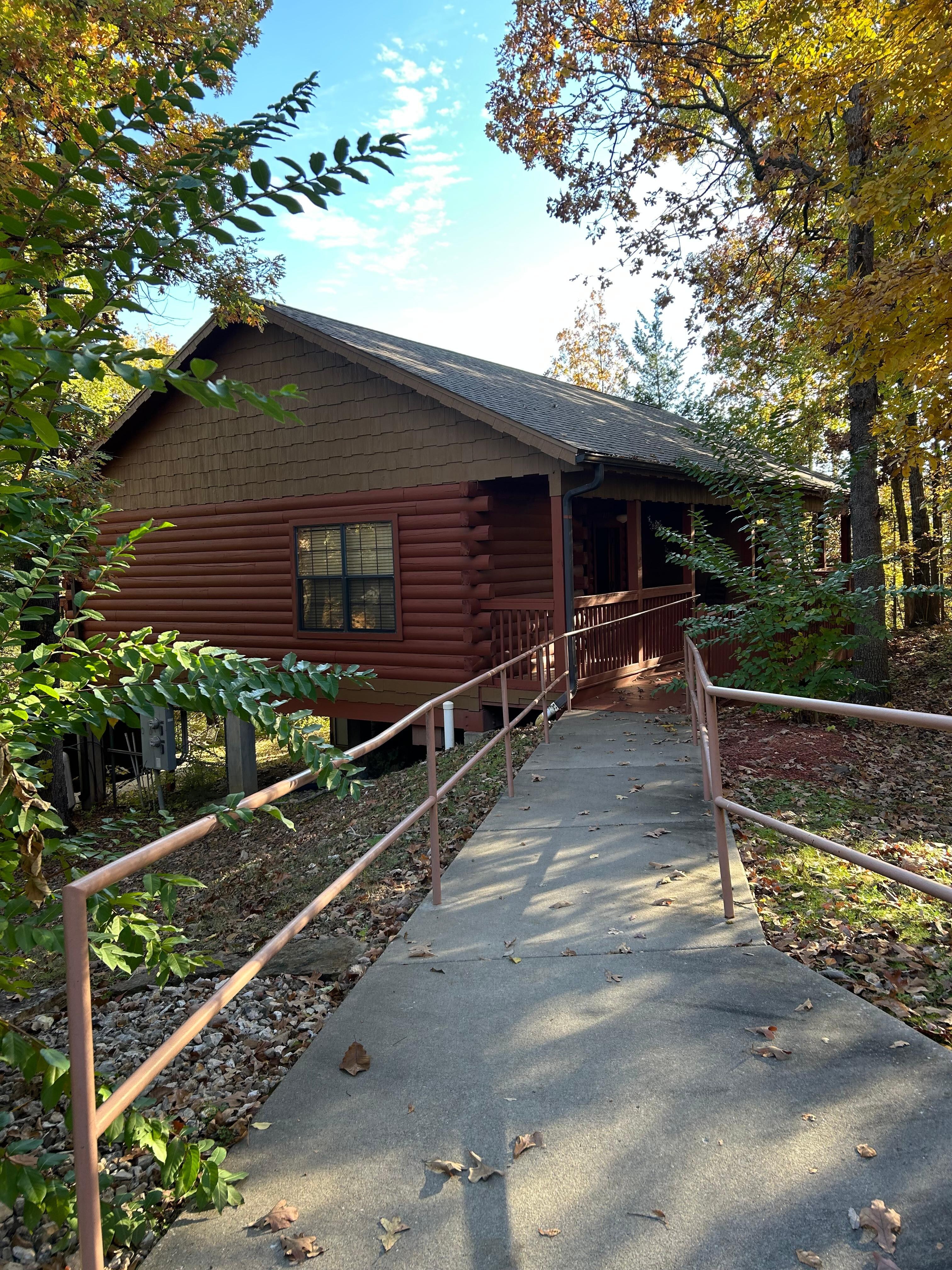 This inviting walk-in cabin with an open floor plan and beautiful views is ideal for a romantic retreat. It features an ensuite whirlpool tub, a fully-equipped kitchen, and a living area with a cozy seasonal gas fireplace and a sleeper sofa. The private balcony provides a serene spot to relax. Although just minutes from Branson's restaurants, shows, and attractions, you might find it hard to leave! Additional comforts include an in-unit washer and dryer, free wireless internet, and seasonal outdoor pool access.