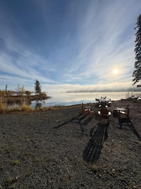 This open floor plan cabin is the perfect getaway for couples and families. It has a beautiful living room and fully functional kitchen stocked with spices and seasonings. Look out the huge windows that look over the lake or sit on the large dock and read a book. Paddle boards, Kayaks, and a fire pit are included. Grocery and liquor stores are only a 7 minute drive away. Please note: second bathroom is a large heated building 30 steps from the cabin. Equipped with large shower, toilet and washing machine for your use! An additional trailer which sleeps 7, is on the property for an additional cost per night during May-Nov. please inquire.