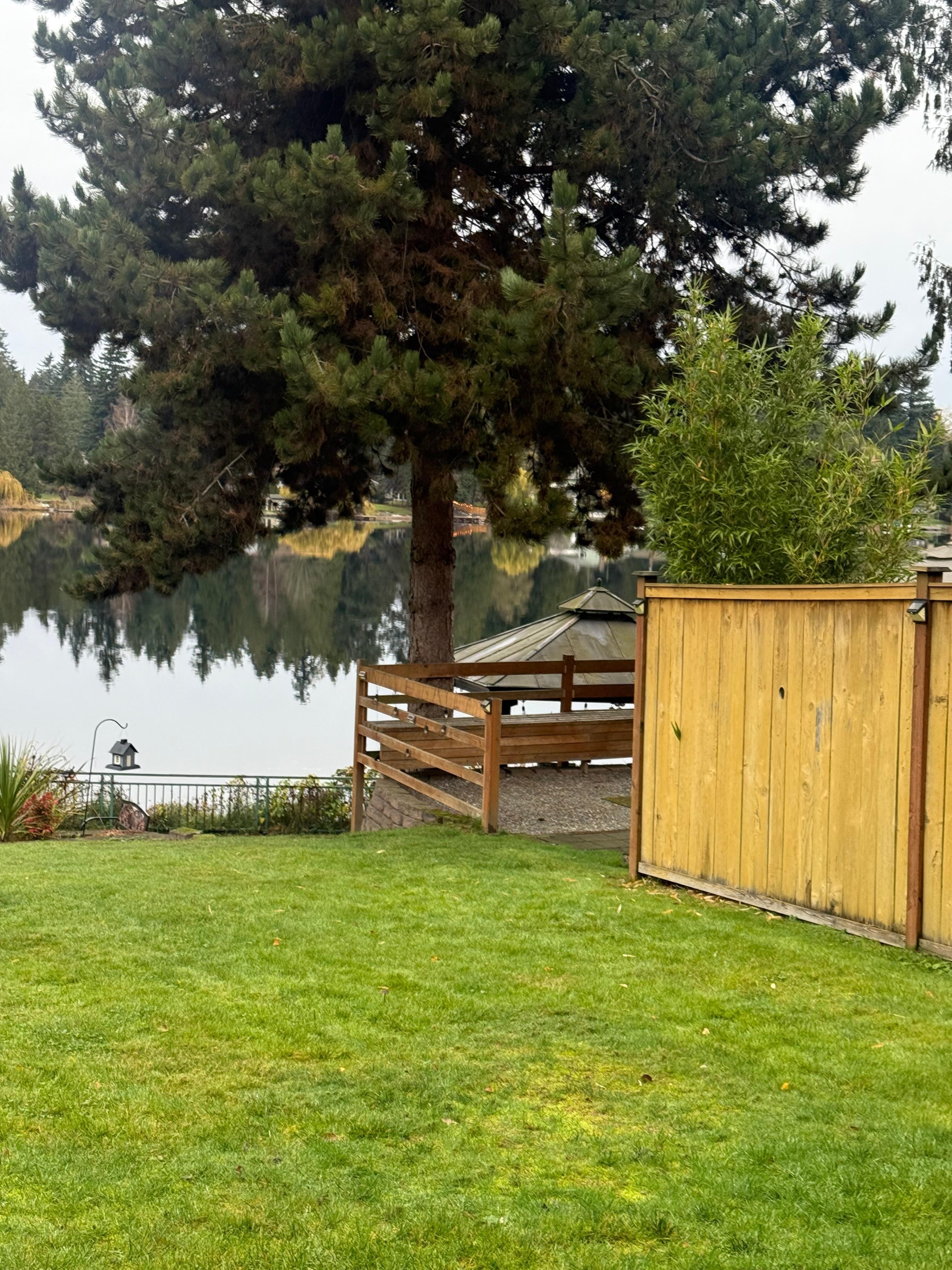Star Lake Waterfront, spacious fenced yard, with numerous spaces for eating, cooking or just relaxing with a gorgeous view of the lake.