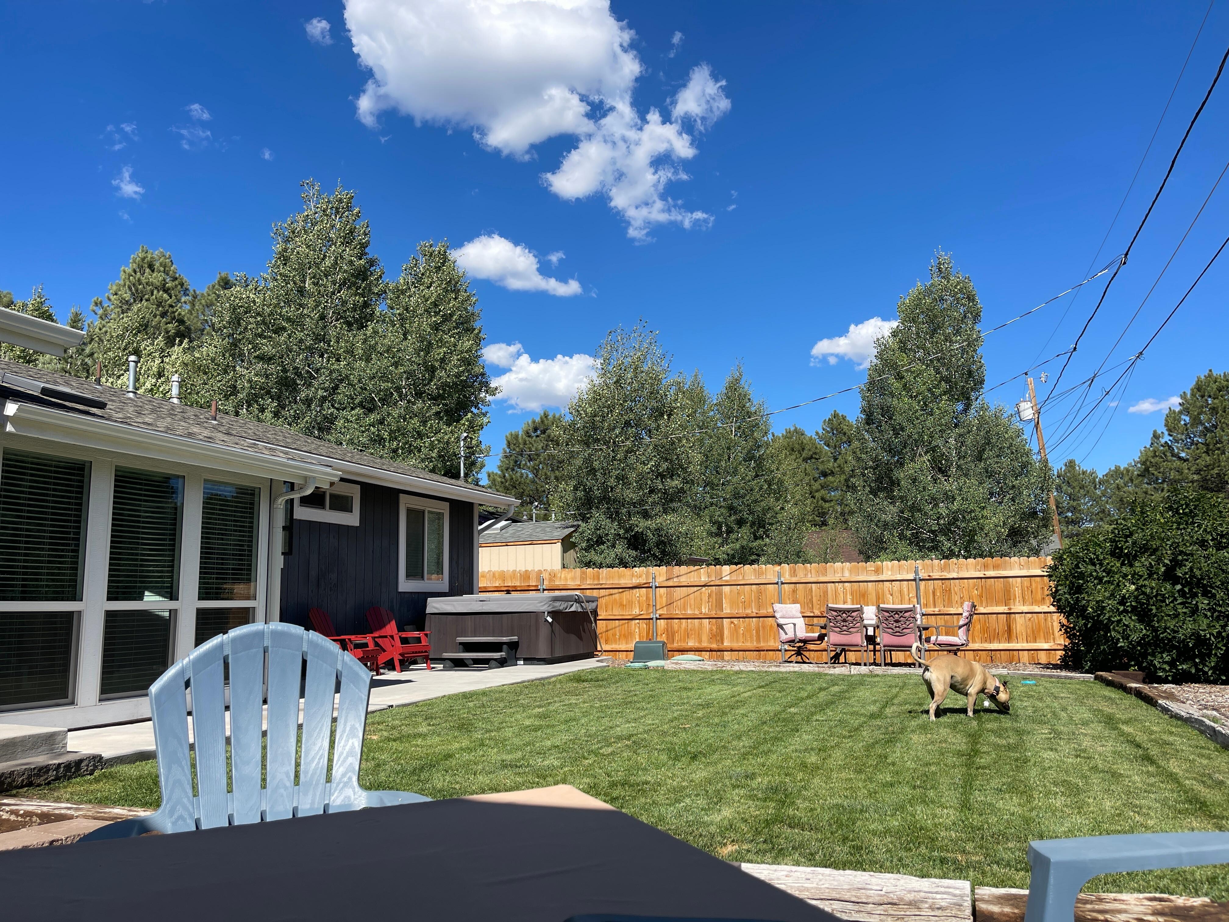 BACKYARD: Hot tub, propane gas grill, propane fire pit, yard games (corn hole, giant Jenga, horse shoes), Adirondack chairs, picnic table, ponderosa pine views