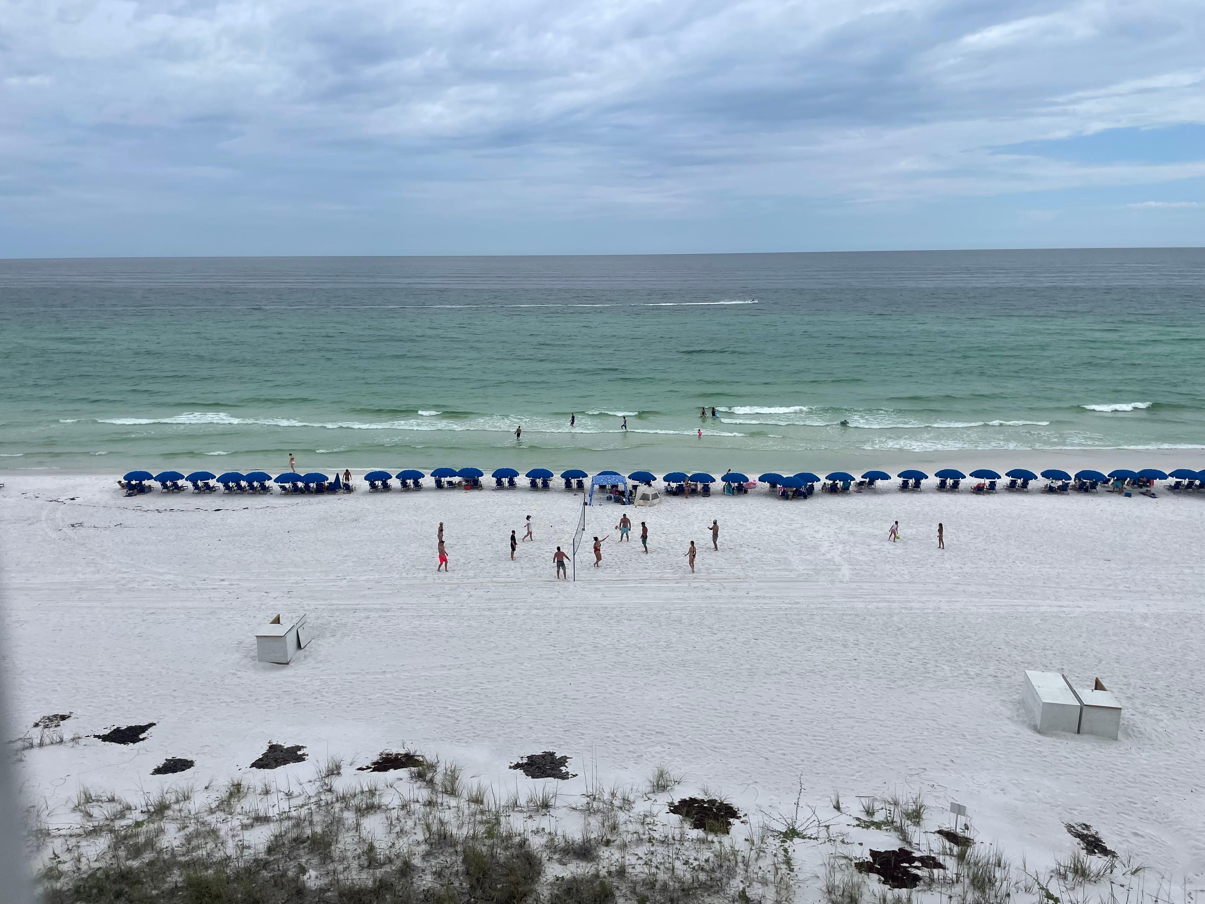 You’ll feel right at home in condo 503. It has been renovated with modern furniture, décor, and wood plank ceramic tiles throughout the entire condo, including the balcony! This spacious 2BR/2BA beachfront condo has direct ocean front views with no obstructions and is at the optimum height, not too high and not too low, as it is on the 5th floor of Destin Gulfgate. The living room features contemporary furniture with a queen size memory foam sofa bed, and a 60-inch flat screen smart tv with blue ray player. The dining area next to the kitchen has a large dining table for 6 and a bar counter with 3 large bar stools. The kitchen has been updated with shaker cabinets, granite counter tops, all stainless-steel appliances, and has a full size under counter ice maker. The unit also features a full-size washer and dryer. The master bedroom features an upscale dresser, nightstands, and headboard along with a premium king size mattress and 55-inch flat screen smart tv with blue ray player. In addition, the master bedroom has a direct ocean front view with direct balcony access making for a very comfortable stay. And for added comfort the attached master bathroom is newly renovated with a custom walk-in stone and pebble shower and quartz countertop with a sit-down makeup vanity area, large mirror, and linen closet. The guest bedroom features 2 queen size beds with headboards, premium mattresses, chest, and 47-inch flat screen tv with DVD player. The guest bath has a granite countertop with large mirror, a tub bath, and linen closet. The large oversized balcony features all wood plank ceramic tiles with new high-end outdoor furniture including a table with 4 elevated chairs and 2 chaise lounge chairs for laying back and relaxing while you’re soaking up the sun and beautiful gulf views! This unit offers free beach service March 1st through the Sunday after Thanksgiving. (Monthly reservations do not receive complimentary beach set-ups.)