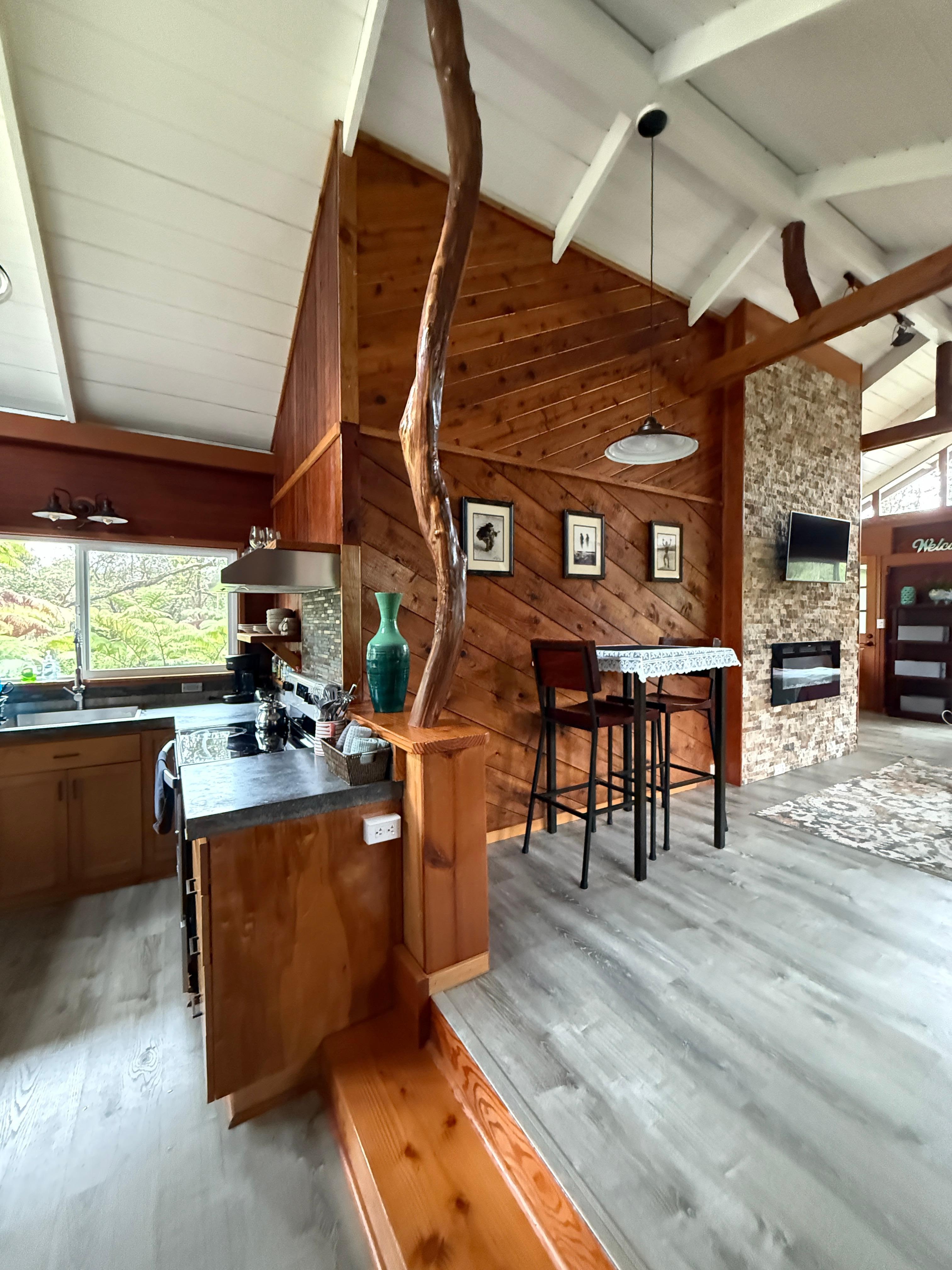 The kitchen with concrete counters has a full size range and oven, refrigerator and enough counter space and small appliances to prepare meals. Dining seating is at the high top table for two inside or on the back lanai. There is a comfortable loveseat and SMART TV for streaming entertainment in the living area. Free WiFi throughout the Cottage. The electric fireplace can be turned on for heat and/or visual flames. The queen size bed has views of the forest from two angles. There is an air mattress that can be set up near the bed for a third person. The gorgeous bathroom hosts a large, tiled shower, toilet, sink and good sized closet. We've stocked the home for your comfort and use during your stay in Volcano. E Komo Mai (Welcome)!