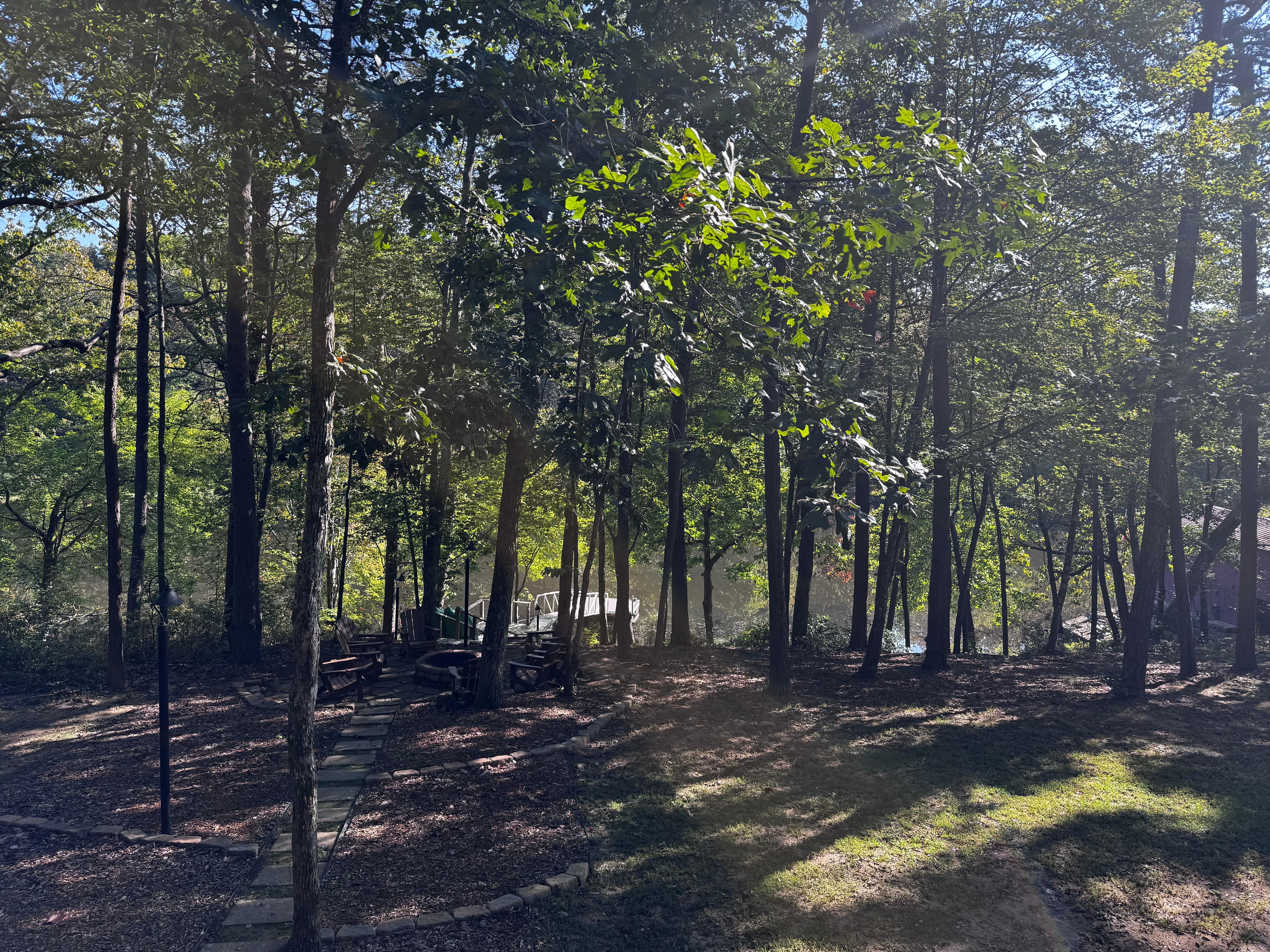 At Lazy River Cottage, enjoy a 32' long covered sitting porch facing Little River, complete with a 5’ porch swing and 4 of your favorite rocking chairs. Lazy River Cottage has three bedrooms and a sleeping loft. There are two large master bedrooms, both with king beds, private master bathrooms, and a wall of windows with beautiful river views, one on each floor. There is a third bedroom upstairs with a queen bed and semi-private bathroom that is shared with a large sleeping loft. The sleeping loft sleeps four with two twin beds, each with trundles. See the bedroom and bathroom floorplan layouts at our website www.littlerivervacay.com. Downstairs is "wheelchair friendly", not ADA compliant, with 36" doorways, a ramp from the parking area, and a walk-in oversized shower in the master bedroom on the main floor. The first floor also includes a half bath, a fully equipped kitchen with dishwasher, multi-cup coffee maker, microwave, island that seats two , dining area that accommodates eight, gas fireplace, and washer and dryer. The fire pit area includes adirondack chairs for enjoying the nights by the river. There is a sitting area by the water with a floating dock perfect for fishing, swimming, or kayaking.