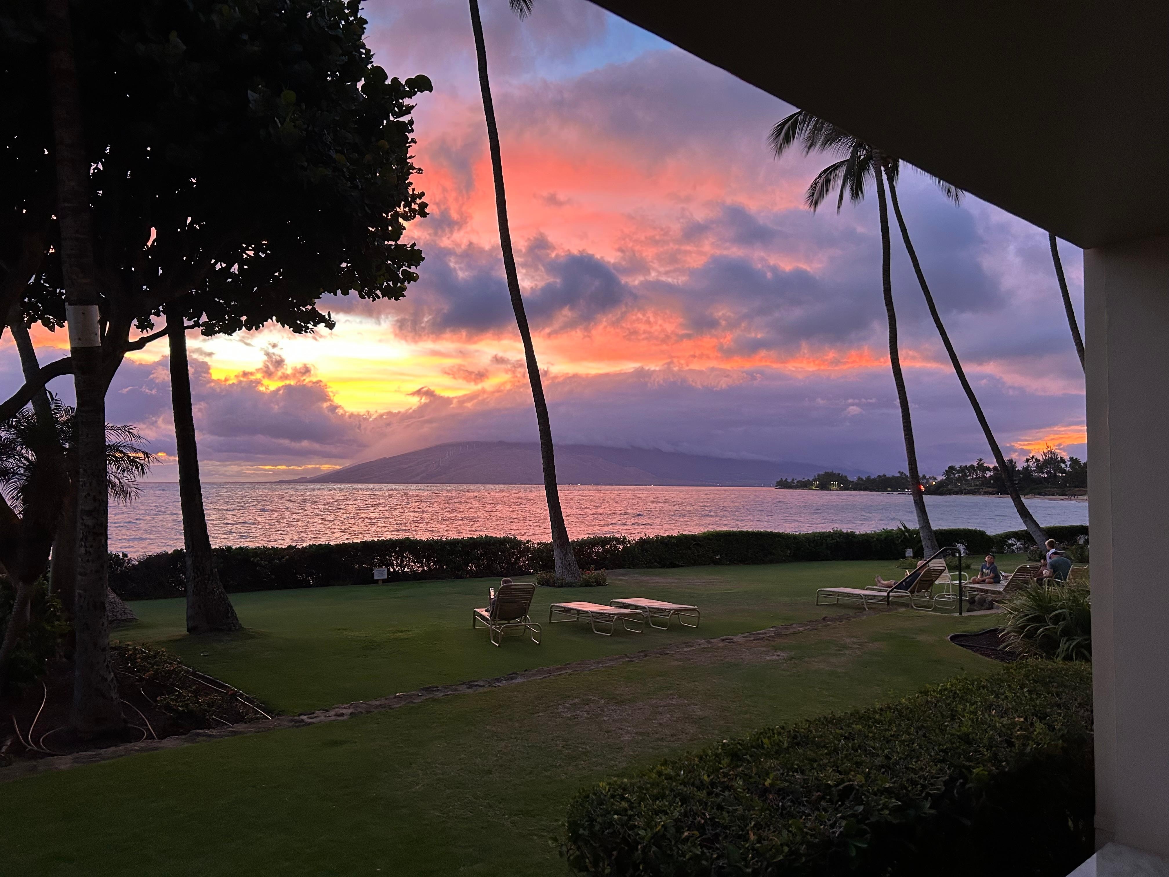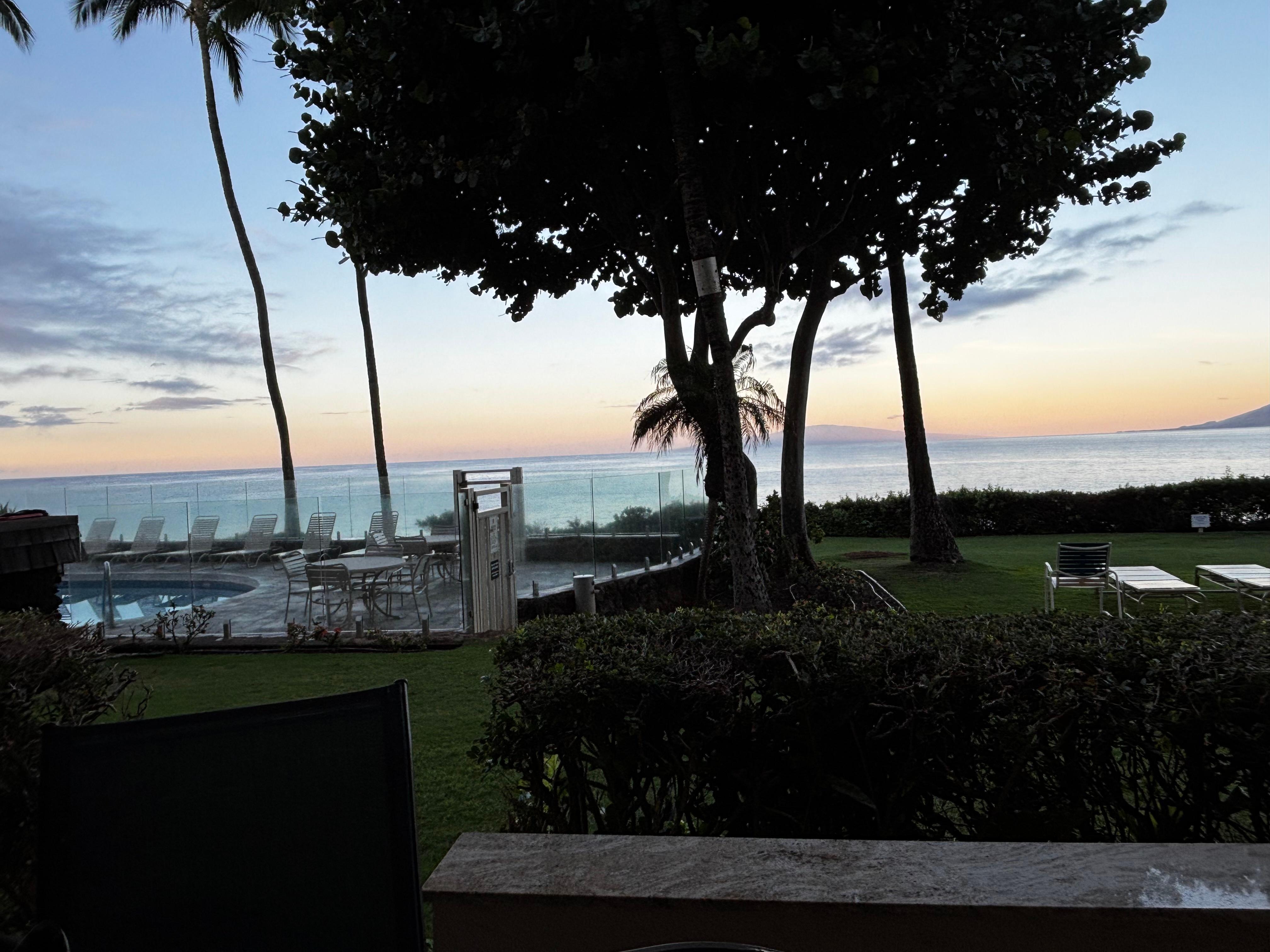 Our OCEANFRONT ground floor Lanai flows out onto a lush grass and garden area only a few steps to the beaches and freshwater pool. Also unobstructed views of Molokini Crater and the West Maui Mountains.
