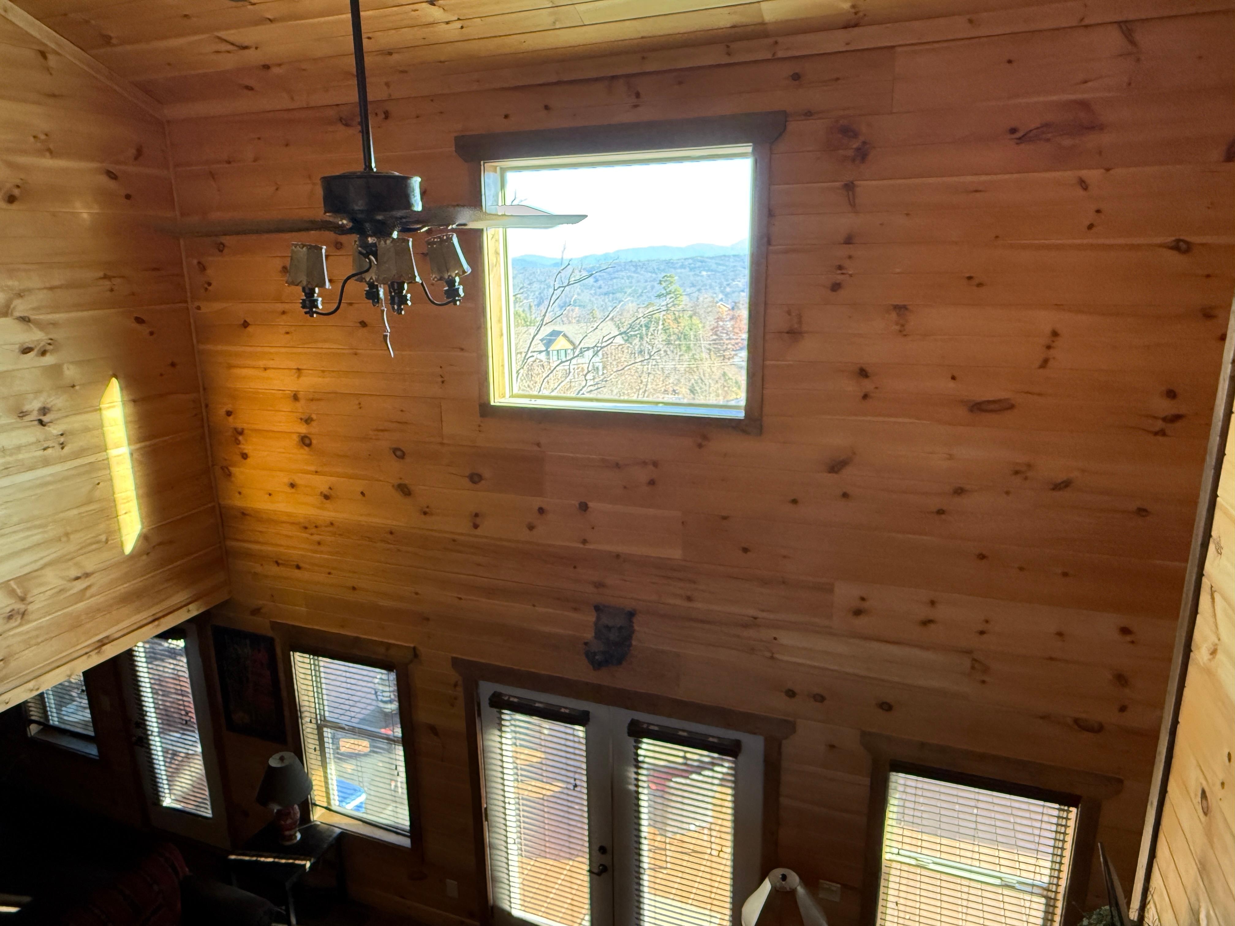 Choose to quietly relax around the fireplace and gaze at the gorgeous views of the valley or kick back and watch the TV. Large windows and doors leading to the back porch provide plenty of natural light which illuminates the entire living area. Window blinds can be used to block out the light and set a more intimate mood if that's what you're aiming for.