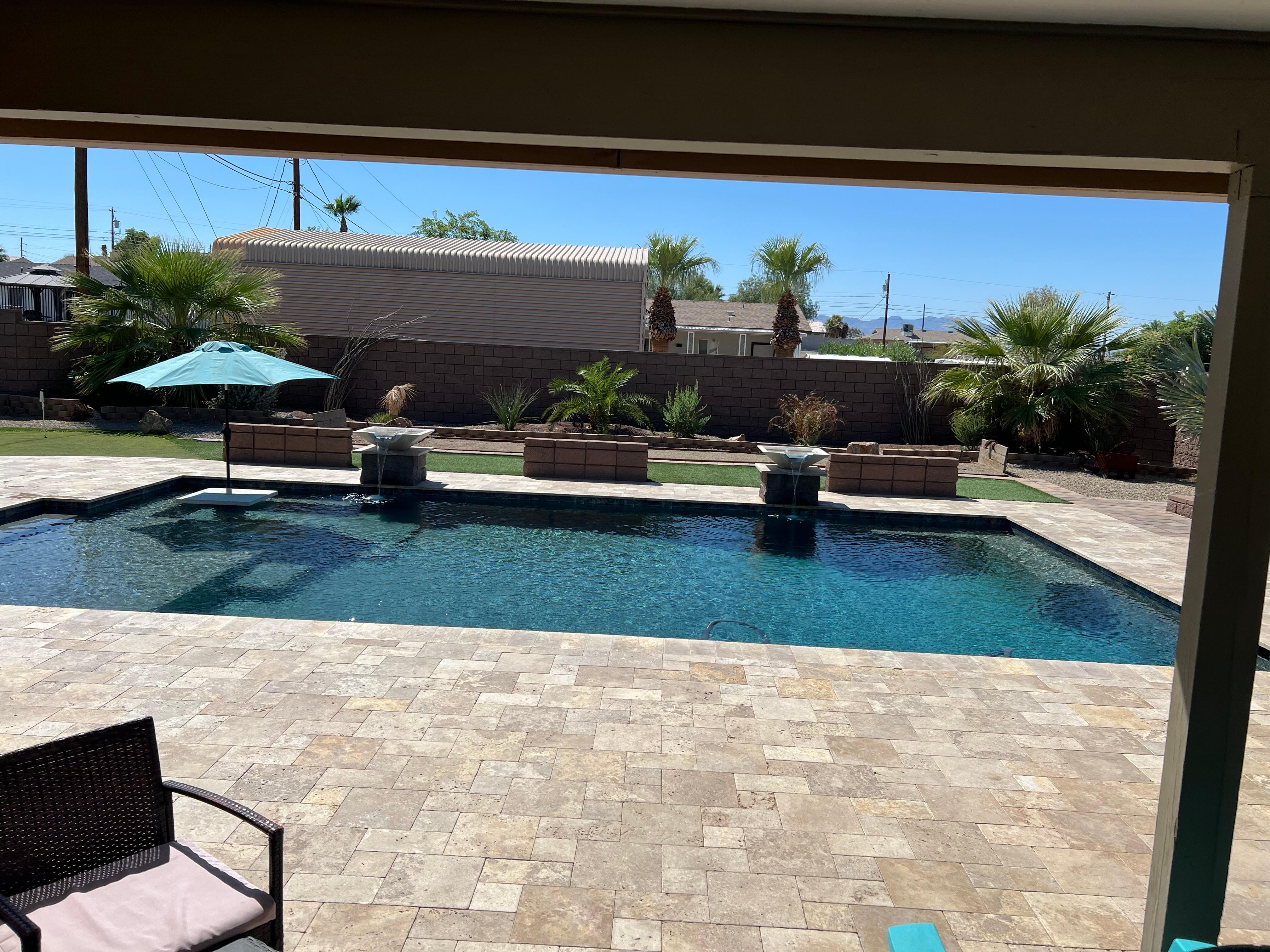 Comfortably decorated three-bedroom, two-bath with newer furniture and bedding. Quick access to highway 95. Located just minutes from the lake, downtown, Walmart, movie theaters and the amazing London Bridge. Plenty of parking for your RV(s) and toys. Quiet street with minimal traffic. Brand new heated pool and walls for privacy. All New Built in BBQ, Over 50 of Granite CounterTop space for the ultimate in entertaining. Putting Green, Horseshoe Throwing Pit, Turf Area for Games. New Patio Furniture and fire pit. Entire home renovation was recently completed. New ceiling fans and recessed lighting throughout. Additional wide screen TV for Gaming! Great backyard space for entertaining, large yard with patio cover and seating. Professionally Landscaped front and back with landscape lighting to enjoy after you watch the another Beautiful Lake Havasu Sunset from the backyard. New water softener, new R/O System, central A/C, relaxing heated pool. This is your home away from home. Additional cost to heat the pool. Easy on and off pool cover will reduce propane costs. Details for heating the pool will be provided as requested.