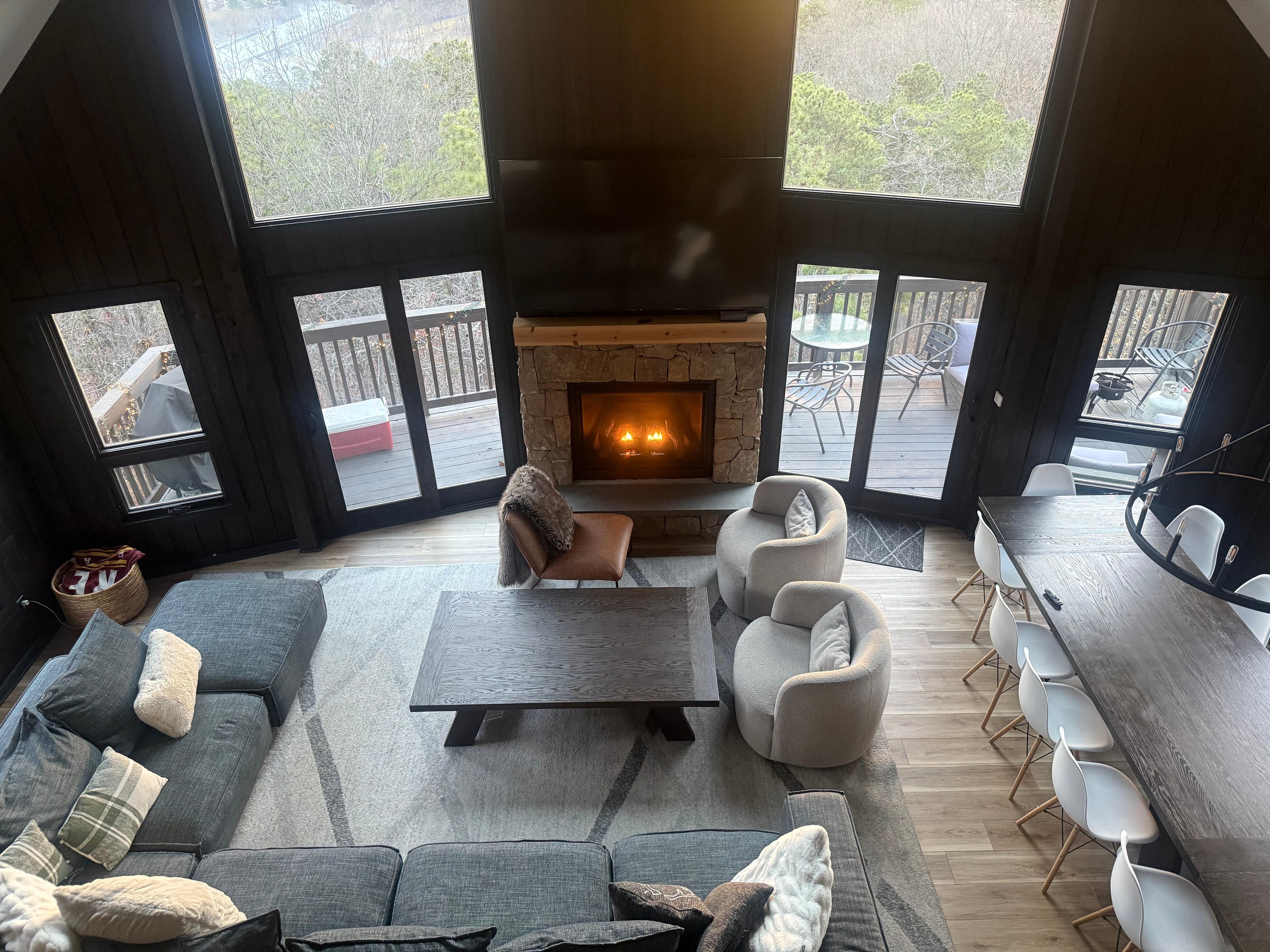 Enjoy time with family and friends in a modern rustic cabin with mountain views or in front of the gas fireplace in a large family room with over 25 foot A-frame windows capturing the view of the ski slopes, the Kettle, and the Blue Ridge Mountains.