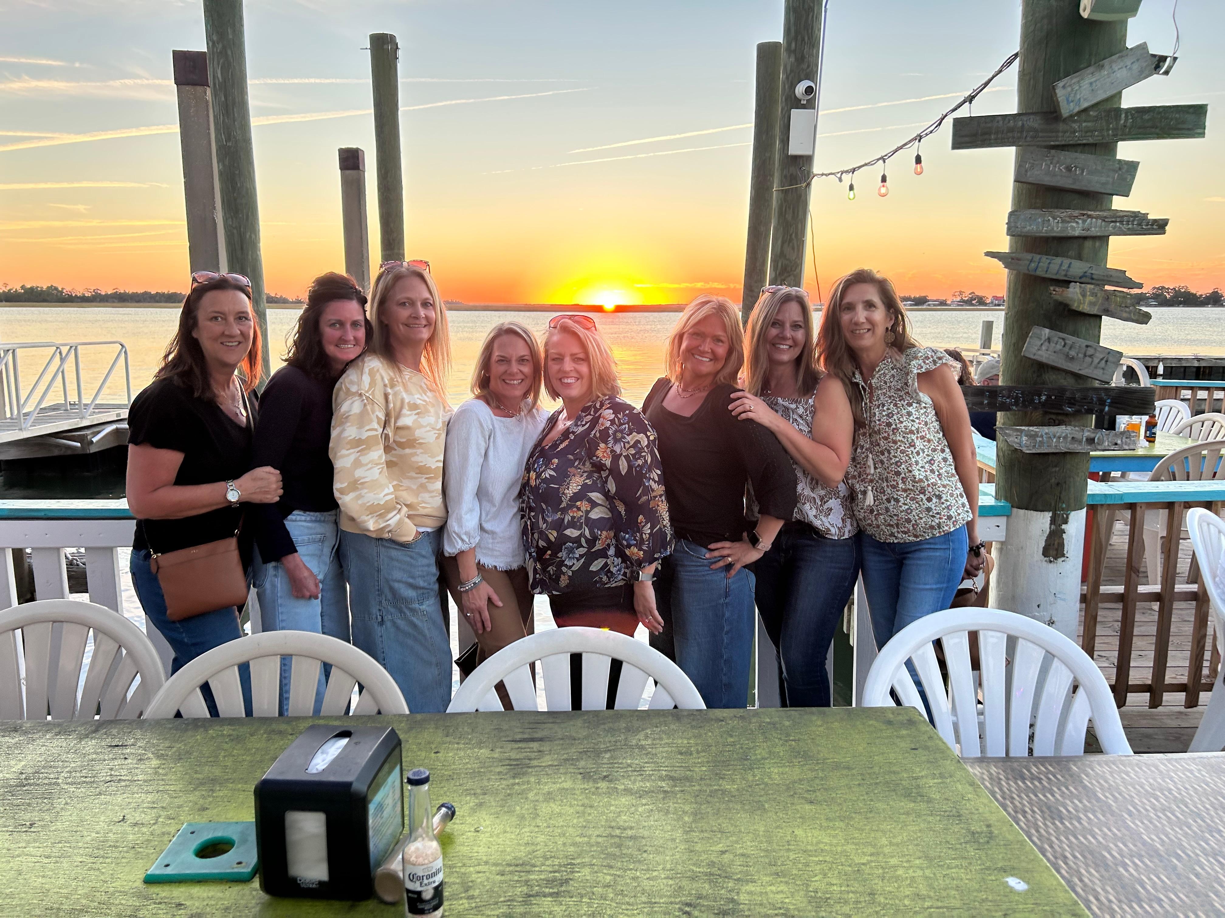 The dining area features a large farm house table that can seat 10 people. The living room continues the coastal vibe with 2 large couches and an oversized chair.