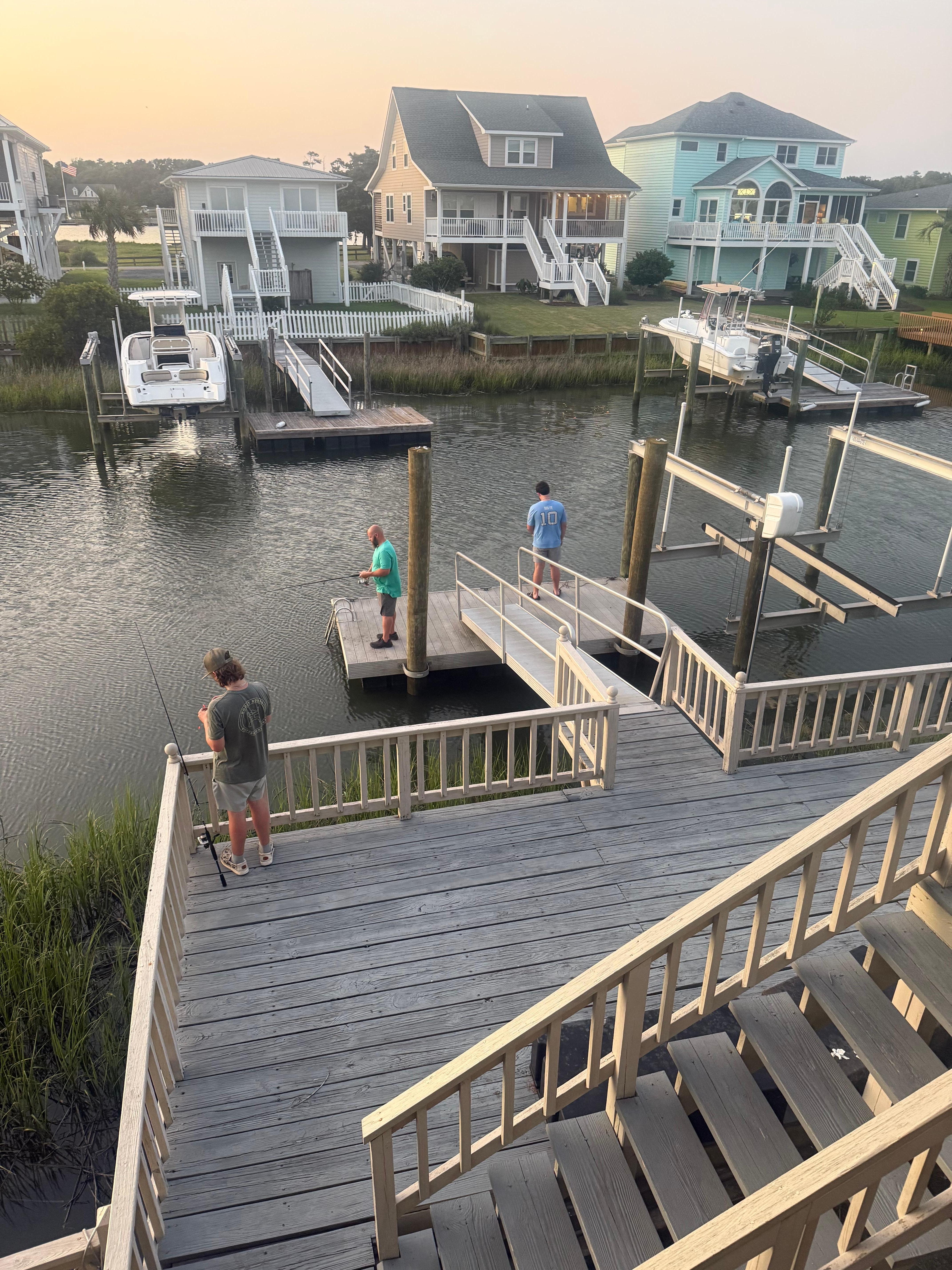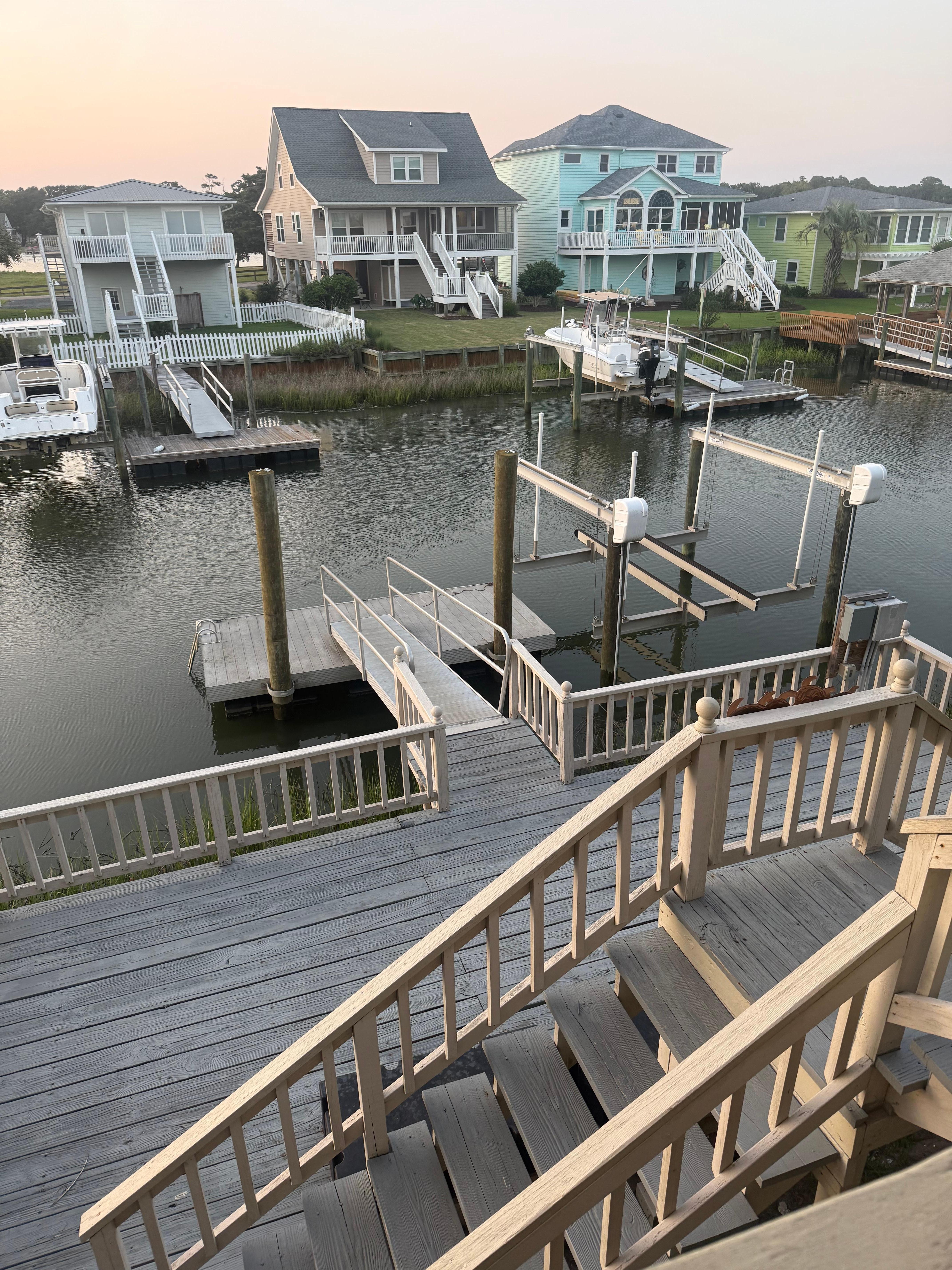Easy check in/out with the new cargo lift for luggage and supplies. Fish straight off the private deck or boat dock. Kayak, boat or jet ski in the canal and/or the inter coastal waterway. Or just enjoy the beautiful views of the coast while you relax on the unbelievable wraparound porch. This house is on a very secluded double lot with beach access only a three minute walk away. It is at the end of a cul-de-sac so the kids can ride their bikes without worry of traffic. There is a huge deck beside the waterway that is perfect for sunbathing, grilling, or lounging. There are two porch swings, ,a picnic table, grill, rocking chairs, Adirondack chairs and an outdoor table with chairs so everyone can enjoy the large porch and yard. There is a huge outdoor private shower and sink with hot and cold water. The house has floor to ceiling windows in the spacious living and dining rooms. There is a bedroom on the first floor with a private bathroom. The upper floor has the master suite with a queen four-poster bed and private bath. The master bedroom also has a private balcony that overlooks the Inter-coastal waterway. There are two more bedrooms upstairs; one with three beds (one full two twins) and the other has a queen size bed. These two bedrooms share a very spacious bathroom. Bedrooms have flat screen TV's. The high speed internet is accessible throughout the property including on the boat dock. Therefore, you can fish and surf the internet at the same time! The living room has a large TV with DVD player and two leather couches which recline. The kitchen has been completely remodeled is well stocked with pots, pans dishes, utensils, appliances and dishwasher. There is also a washer and a dryer. Bed linens & towels are available thru local rental co or you can bring your own.. Starter quantities of paper products, soaps, etc. are provided. You will absolutely love this amazing home.
