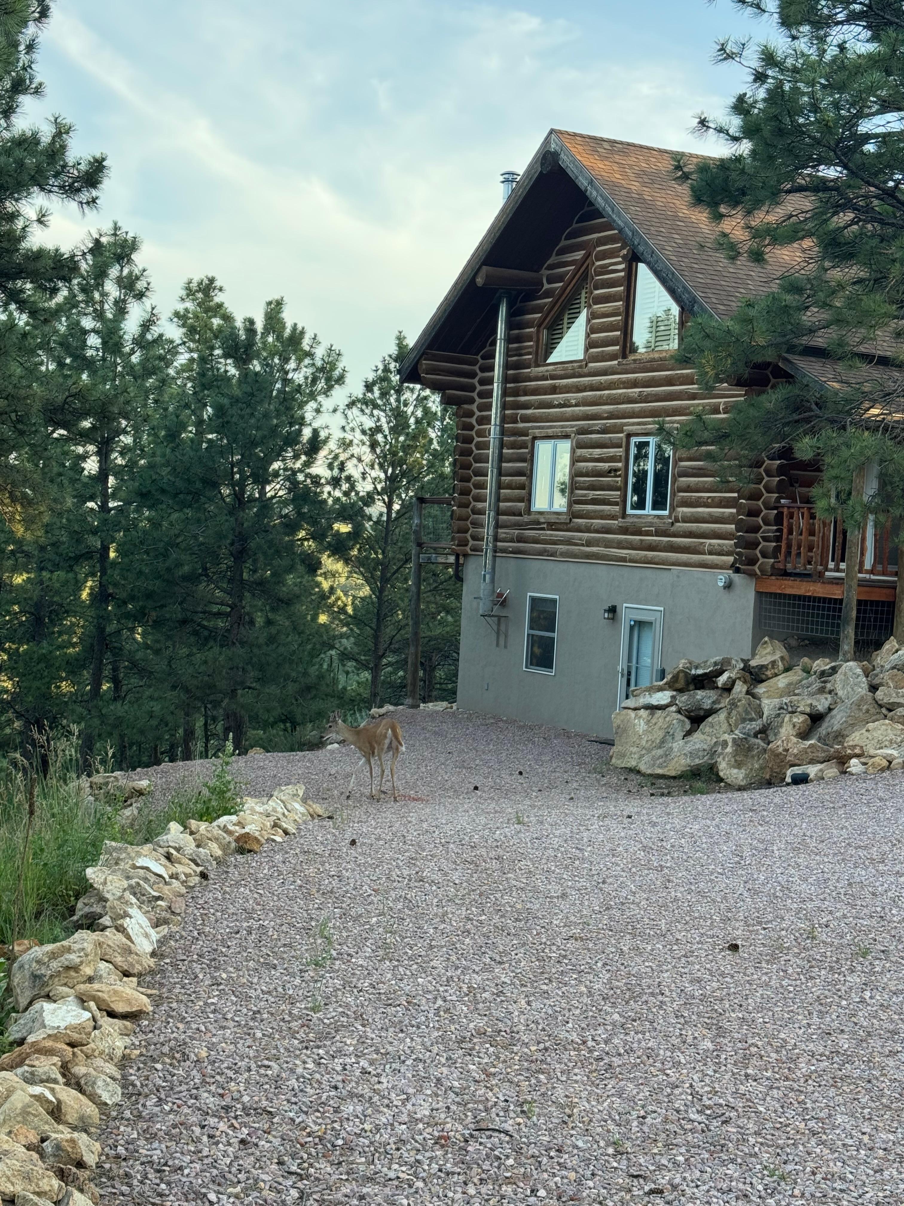 Beauty and adventure inside and out! This completely custom stunning log home was built with relaxation in mind. The home is cozy, yet very open. When here, you will find yourself at one with the beautiful Black Hills. Views of the badlands, thousands of ponderosa pines, along with frequent visits from wild turkey and deer make this property a nature lovers paradise! This 3 bedroom, 2 bath log home has 1 bedroom and relaxation areas on each level, 22 ft high soaring vaulted ceilings, views of the badlands (from 70 miles away!), free wireless internet, 2 smart TV's, fully equipped kitchen, Laundry, gas grill, plenty of parking, walkout lower level, 3 viewing decks and 12 acres to roam and take in all the wildlife!