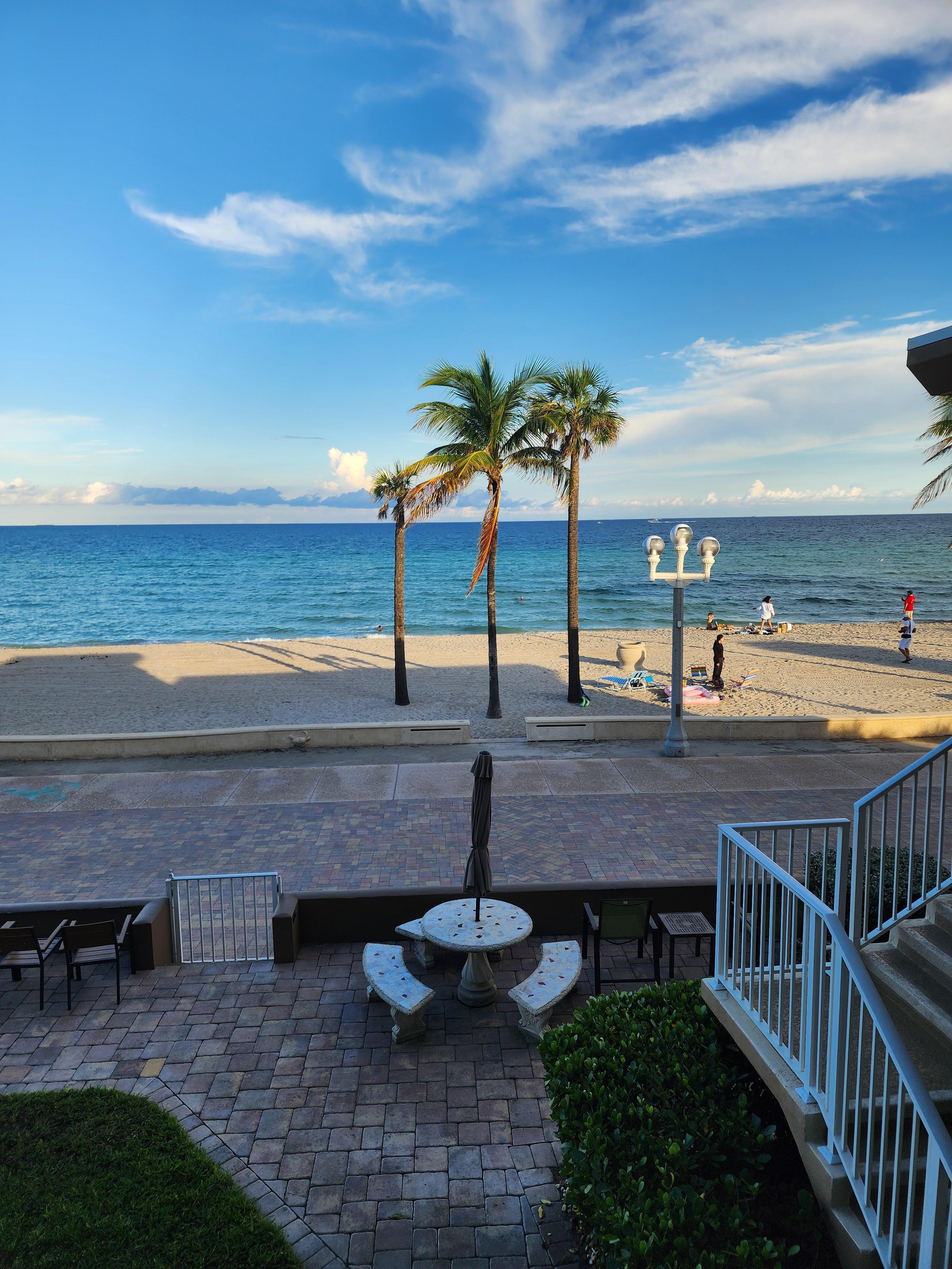 Great beach and ocean view out the front windows, small balcony out the back with a table (one of only condos with that in this complex), with view of pool and in the distance, the intercoastal. Comes with a parking spot. Pool is good size - and I think it's heated. Hours are sun up to sun down. There are beach chairs and umbrellas in the condo. Both traditional and K-cup coffee makers. Decent wifi that works throughout the building and in the front yard, which has some lounge chairs and tables with umbrellas, right next to the boardwalk.
