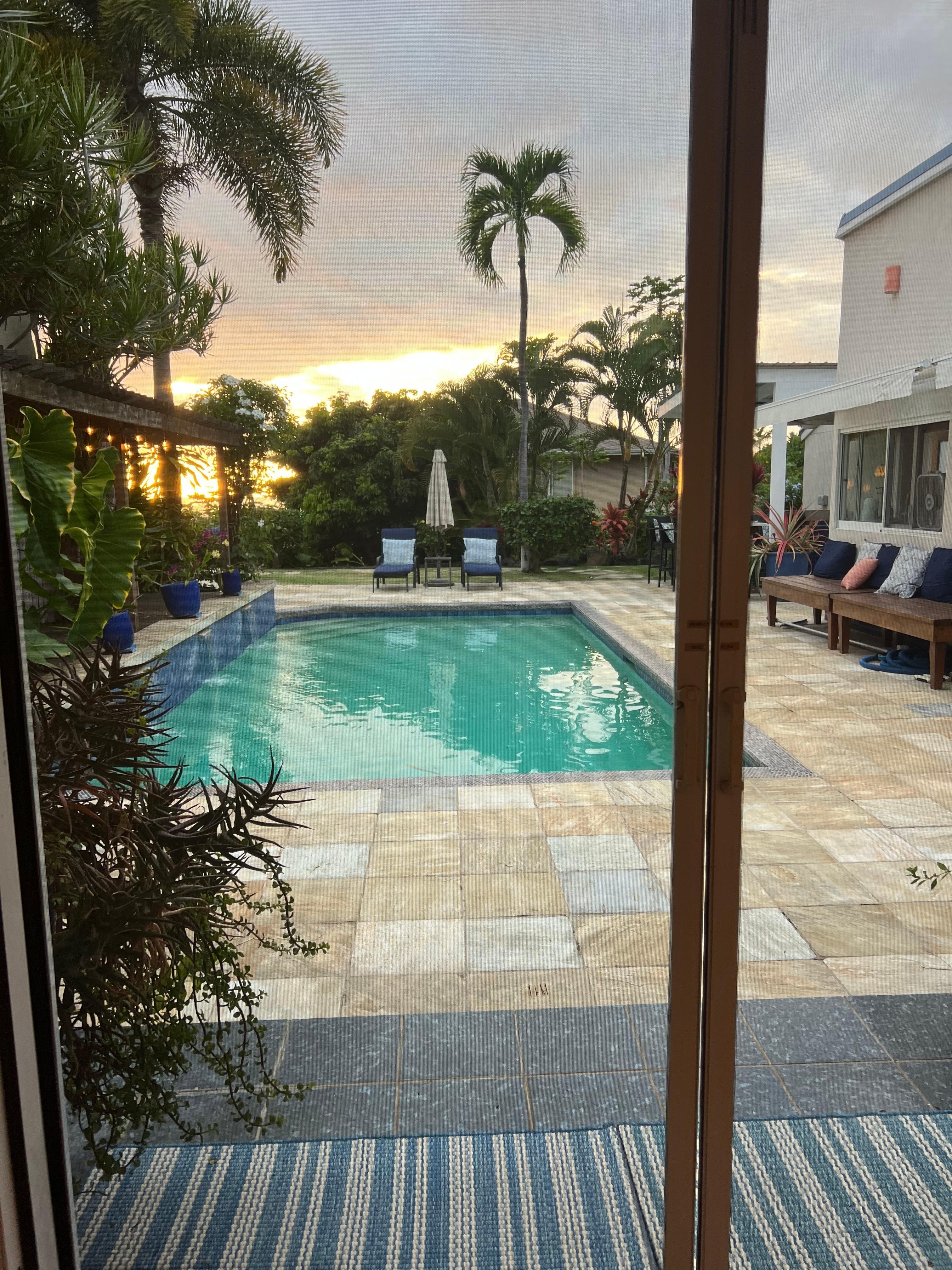 Kololia Living is a beautiful and private 3 bedroom, 2 bath home set on 1/3 of an acre. It's neighborhood setting places it close to Kona's beaches, and a nearby walking trail. The grounds are studded with beautiful, lush plants, including many different fruit trees! The home flows around a large, sparkling swimming pool, and there is a dedicated BBQ area as well.