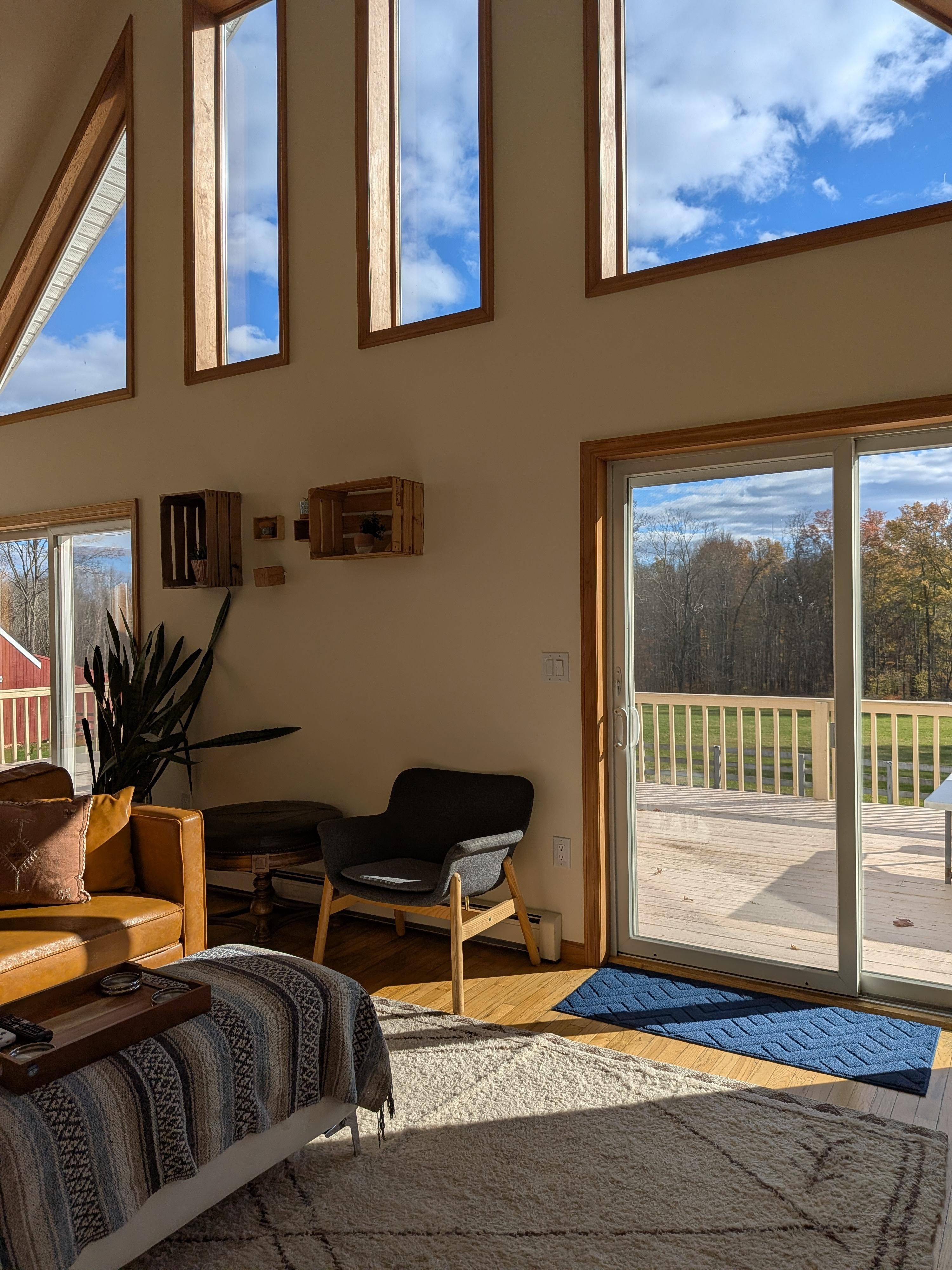 Inside, an open, sundrenched living area provides a cozy and spacious environment for relaxing, cooking, and enjoying the view as deer graze across the field. Smart TV with Hulu/Netflix included + vibey electric heater provide extra warmth and entertainment to gather around by night.