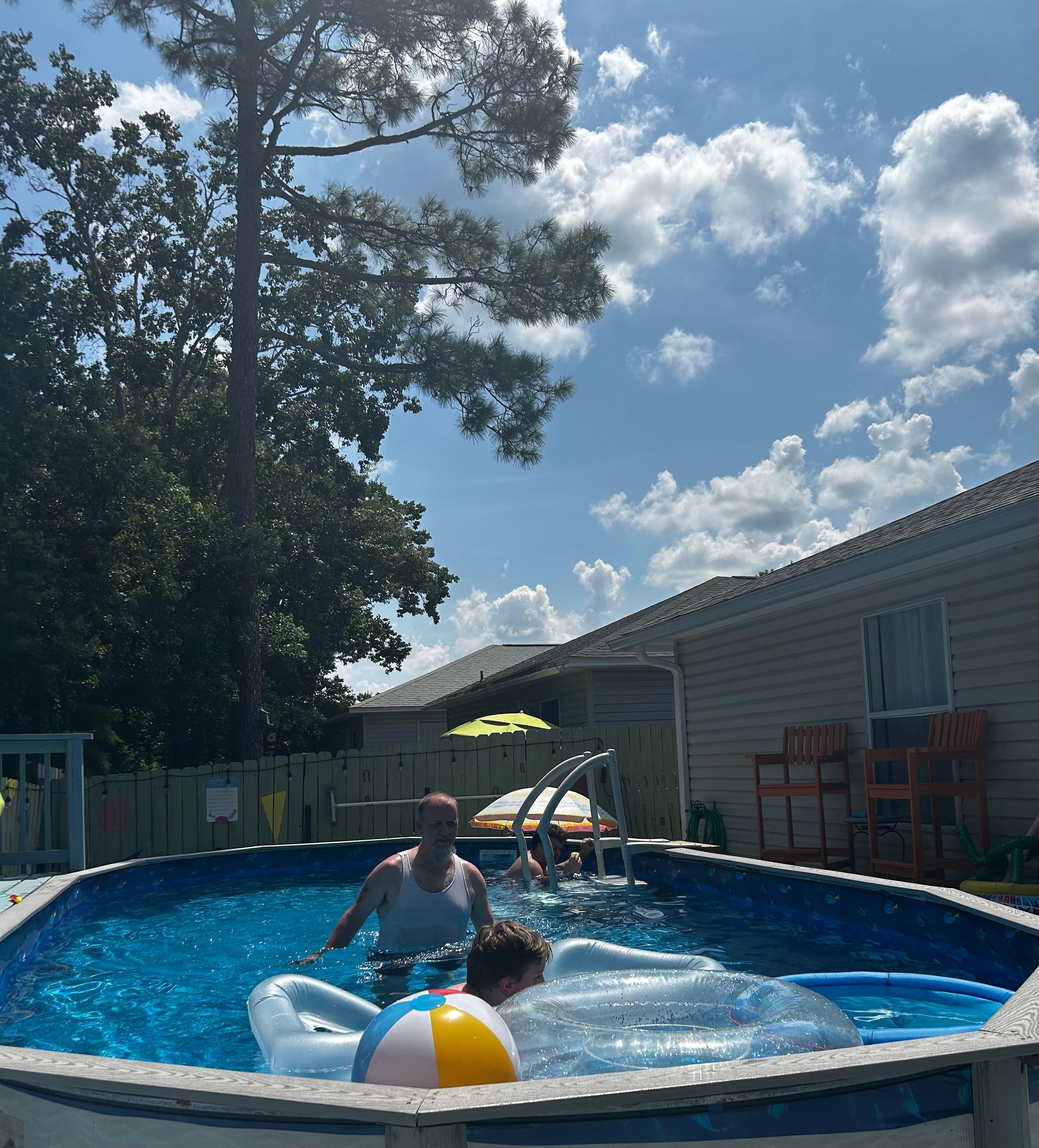 Private yard, gas grill, dining area, seating, pool (keep in mind the pool is not heated) w/ toys, blue tooth speaker