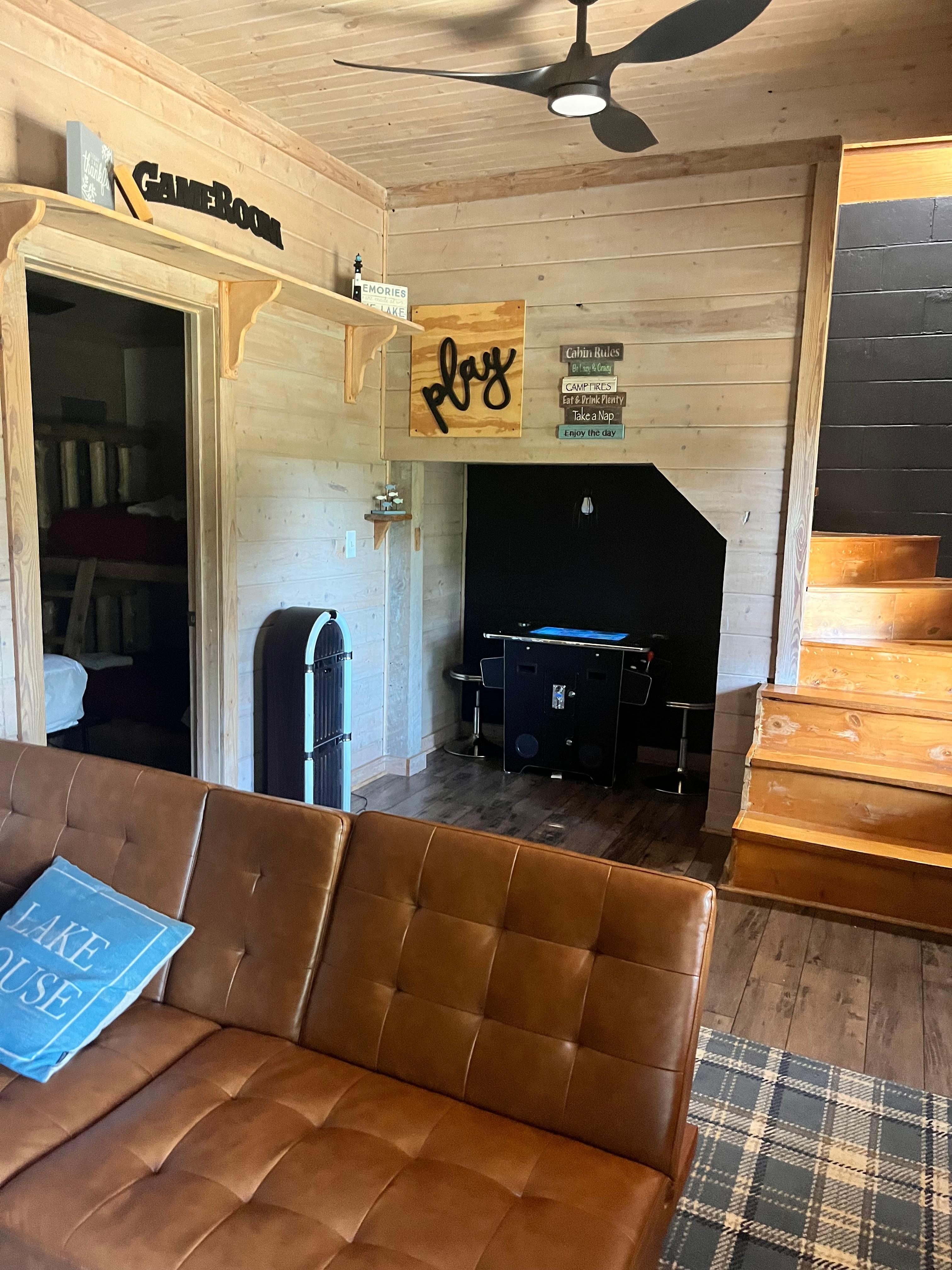 Entering the cabin we found the master upstairs with no clothing storage or closets. The master bath was skinny and the size of an RV bath. No shower except for in the bottom floor. The a/c units were on and extremely loud, so much so we had to turn them off.