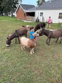 We are proud to be a breeder of Mediterranean Miniature Donkeys touted as the "most lovable animals on the planet." You can have as much or as little interaction with them as you desire. Feel free to hang out in barns and pastures with them and each day we close the gates and let a few free range on the farm. They'll be glad to hang out with you, are very social and want lots of hugs and kisses. You'll be able to say you "kissed ass at Donkeytown" when you leave. In addition, we have four free range goats, Willie, Waylon, Johnny, and June, plus two lambs, Pancho and Lefty, that will greet you daily!