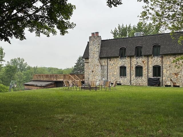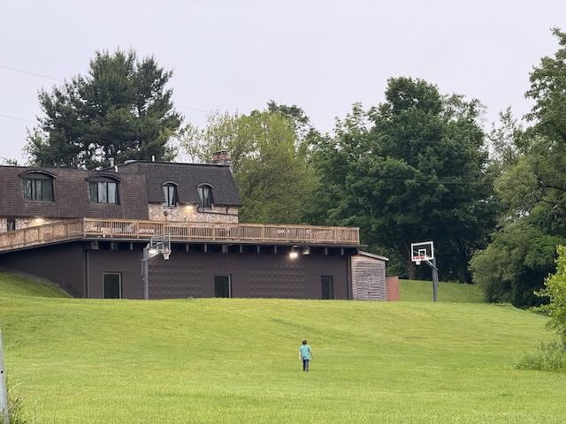 Finally, the 65'x35' deck is the perfect place to sunbathe, hang out, or enjoy an outdoor meal. Located at the top of a hill, the deck overlooks the wide open 19-acres, with views of the outdoor basketball court, the pond, and nearby vineyards. It allows near-360 views of the beautiful Michigan landscape at all times of the year.
