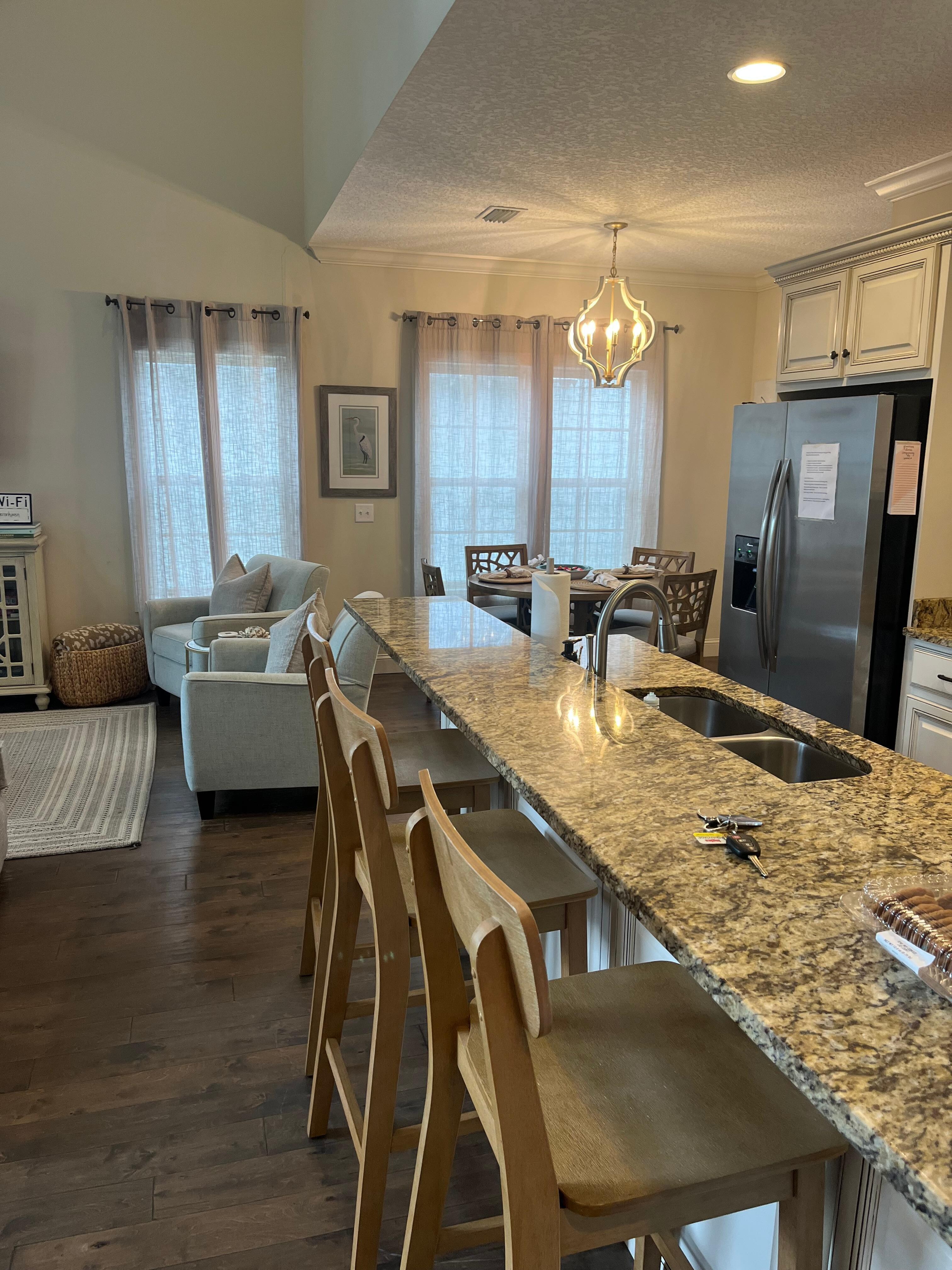 Welcome to your St. Simons Island dream escape, a thoughtfully updated home that blends coastal charm with modern comfort. Just seconds from Sea Palms Golf Resort and minutes from beaches, shops, and restaurants, this property offers the perfect mid-island location for guests who want both relaxation and convenience. From the moment you arrive, you’ll feel at ease. Step through the front door into a cozy den with a sleeper sofa, a quiet retreat perfect for reading or relaxing, before moving upstairs to the main level where soaring ceilings and an open floor plan set the stage for gathering. Here, the kitchen, dining, and living spaces flow seamlessly together, creating a bright and welcoming hub for family and friends. A convenient half bath and a spacious master suite complete this level, providing privacy and comfort for the main guests of the home.