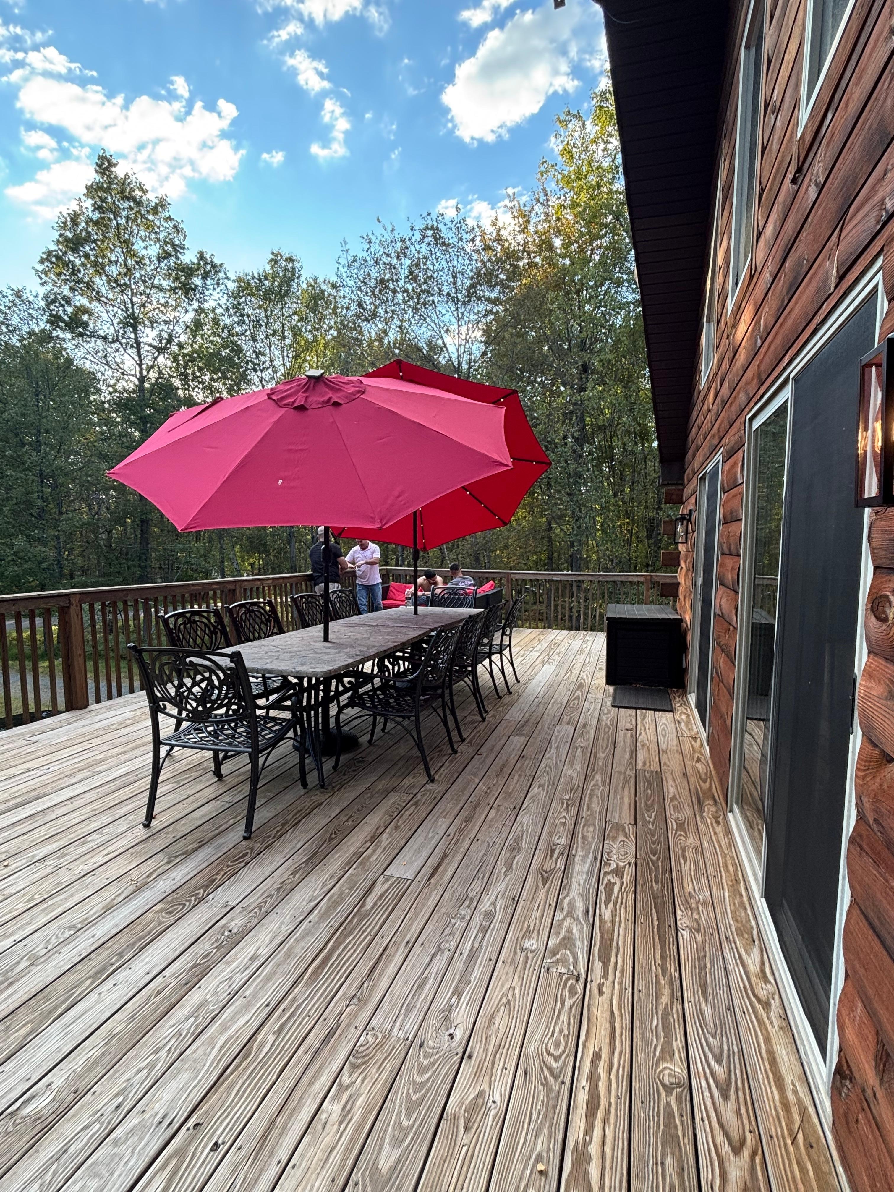 Outdoor Deck: Expansive space with patio furniture, picnic tables, and a grill for family BBQs.