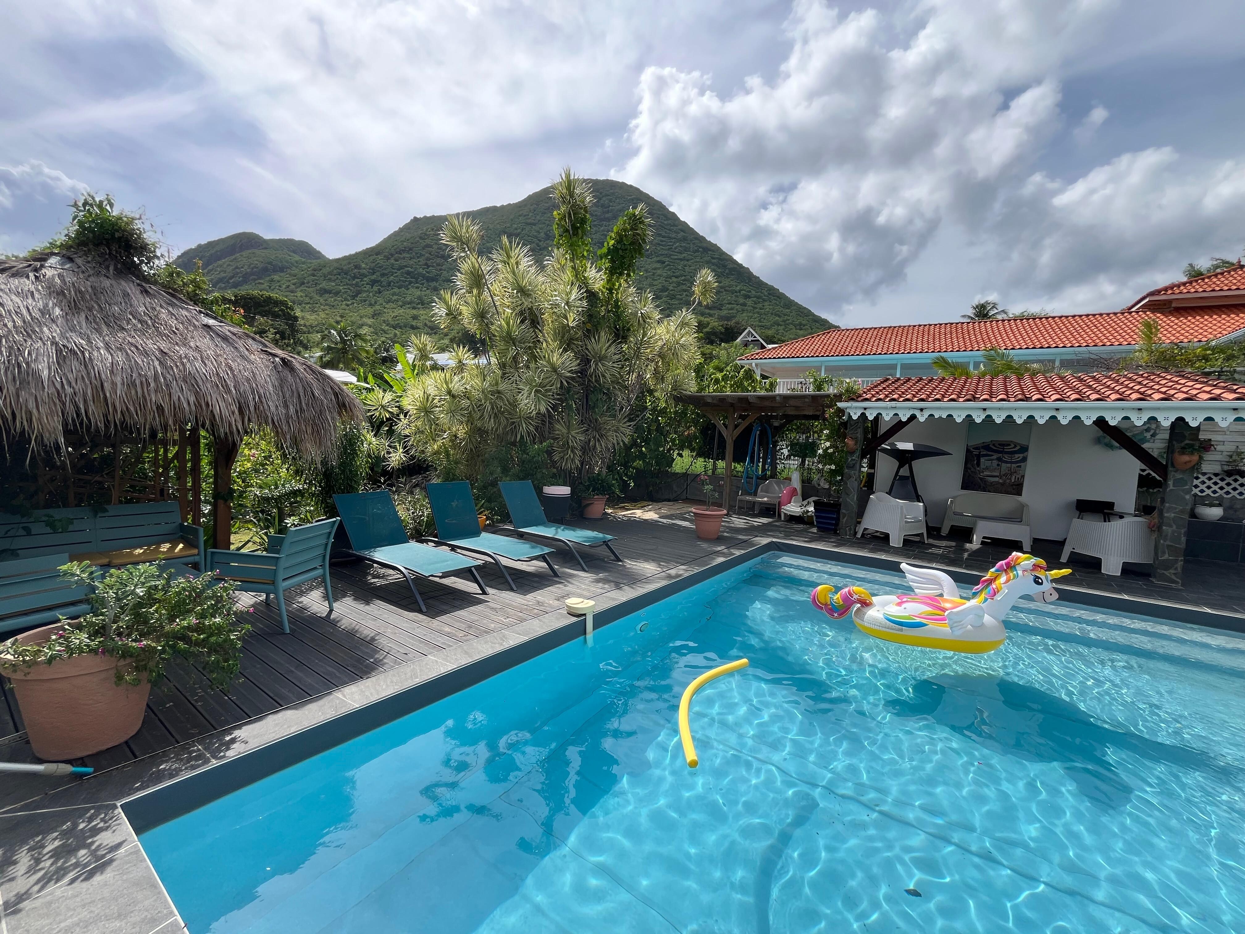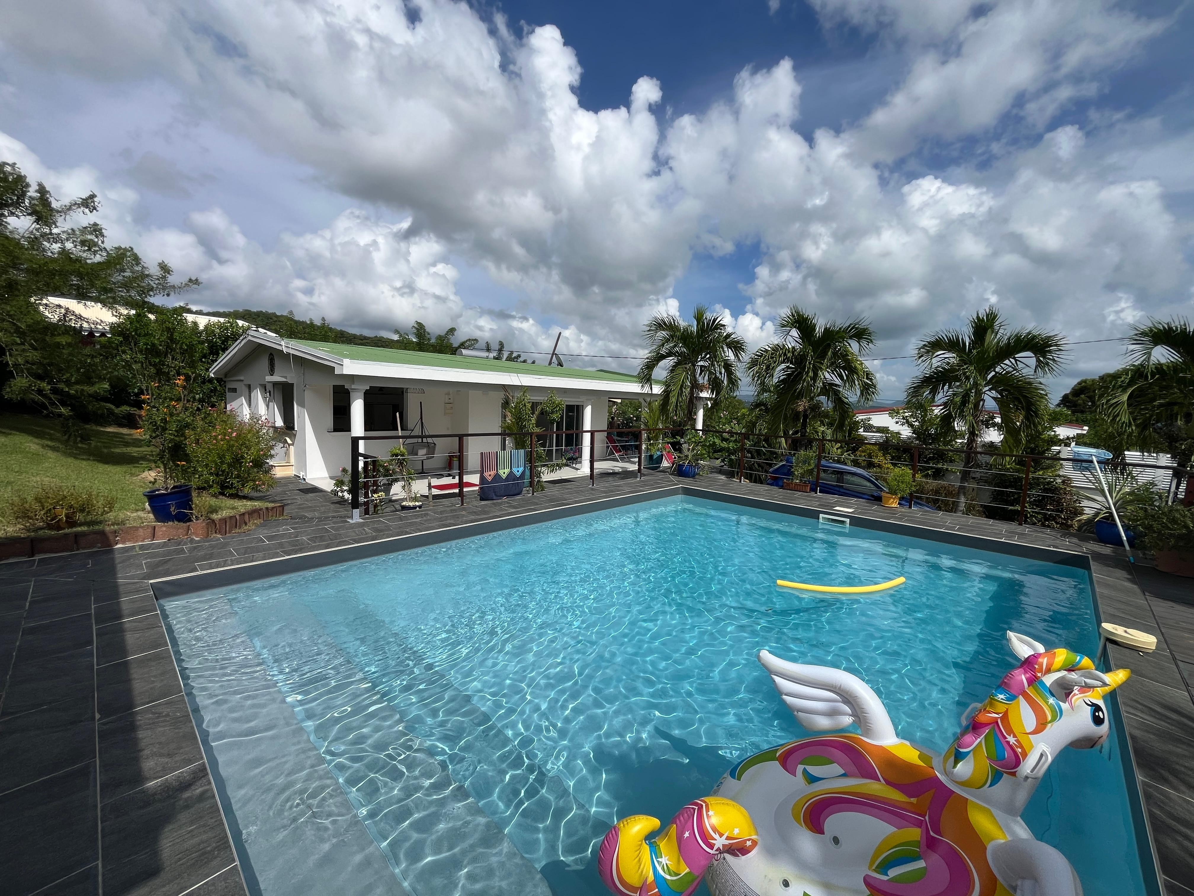 Superbe Villa 3 chambres dans une résidence. Lieux serein et calme au pied du célèbre Morne Larcher (pour ses randonnées). Villa ouverte et éclairée donnant le sentiment d’espace. De quiétude sur terrain clos de 1050 m2. Piscine très agréable attenante. Mer avec vue sur le Rocher du Diamant, à 5 min à pieds. Portail automatique, parking, jardin fleuri…