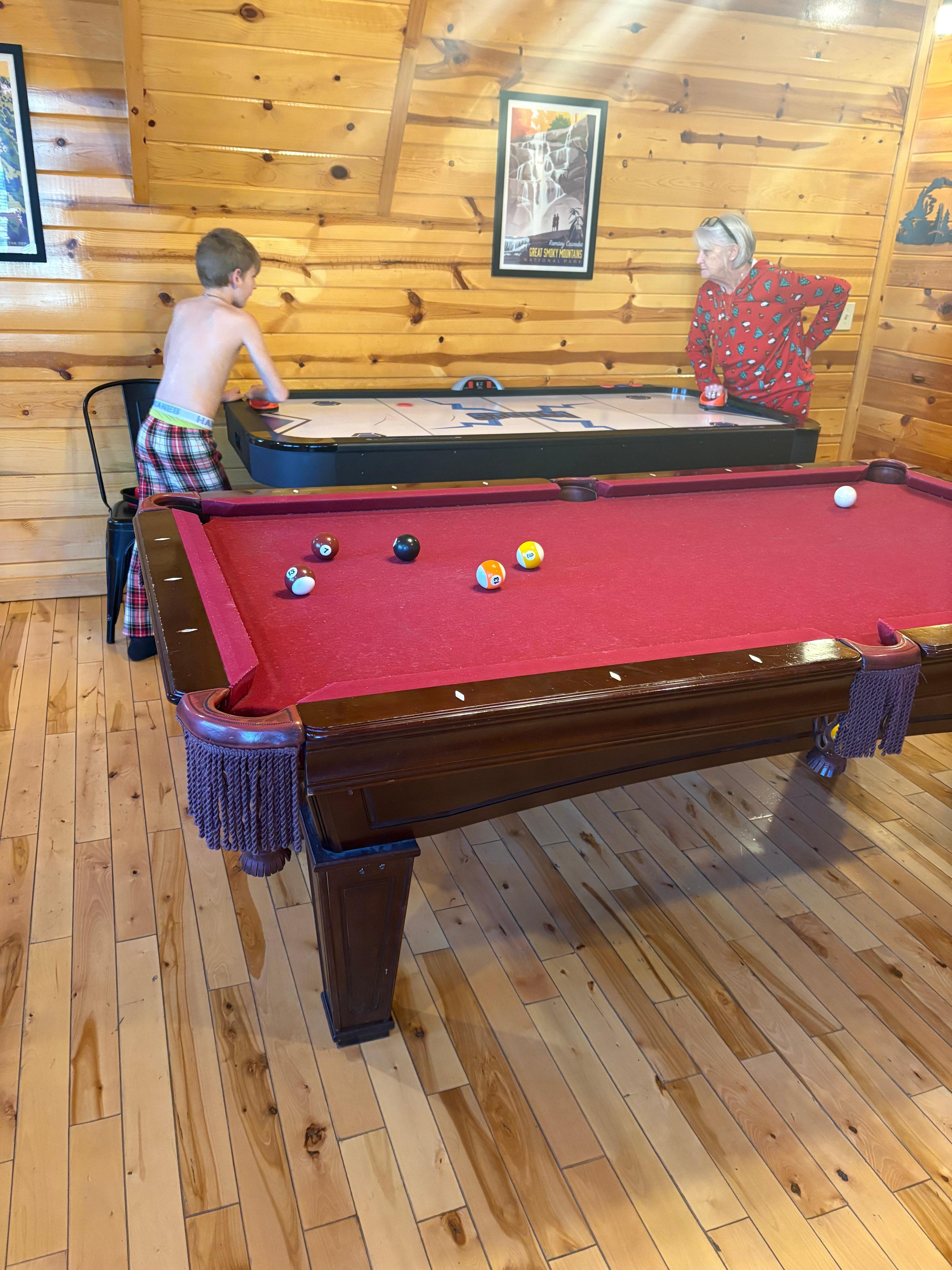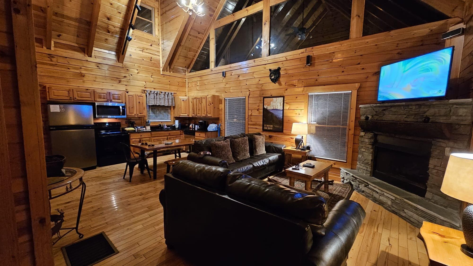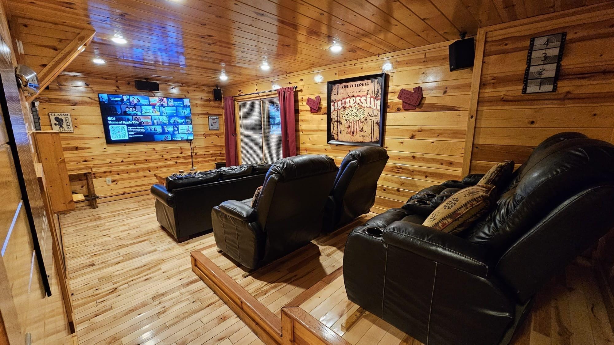 "A Bear Endeavor" is a spacious 3-level cabin. The main level consists of a King suite with jetted tub and vaulted ceilings in the living room and kitchen. This level also has a deck with an eating area and a new grill. The second level is another King Suite and laundry closet at the top of the stairs. The basement includes a half bath, game room, and an updated theater room. There are sleeper sofas in the Game Room and the Theater Room. There's another deck on this level with an eating area and hot tub.