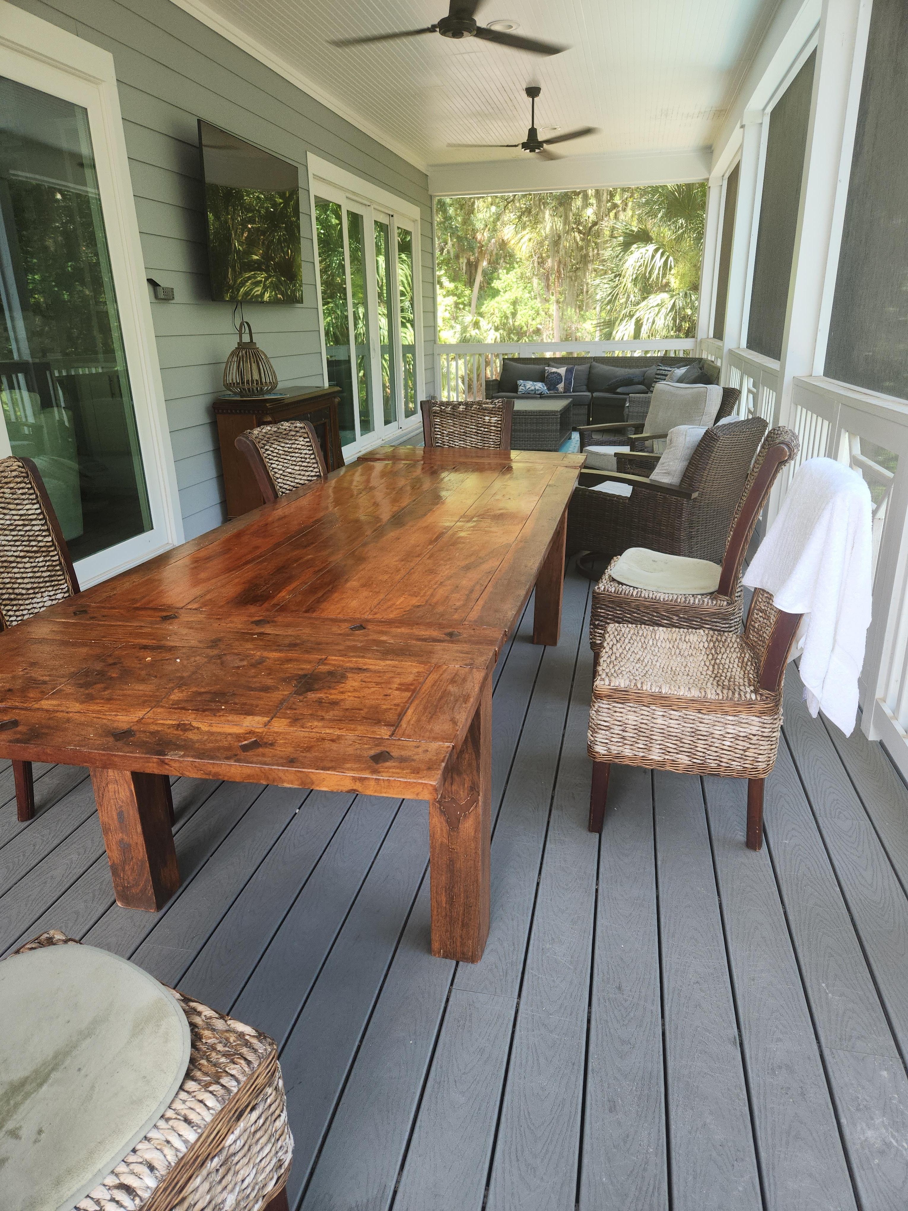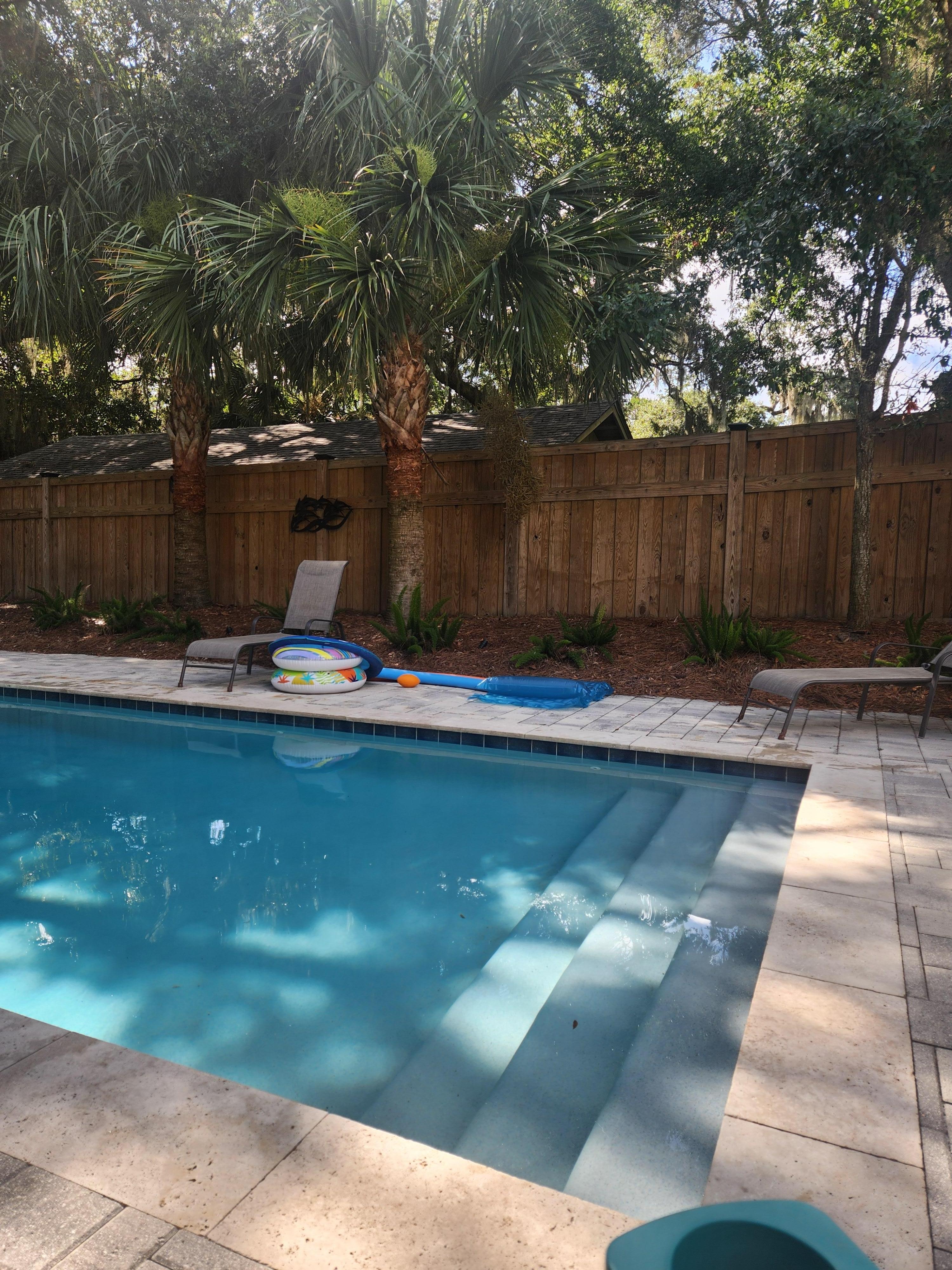 The property is surrounded by a custom designed fence to add to the surrounding beauty of the moss covered trees that gently sway in the summer breeze. The property is professional landscaped and lighted at night to enhance its beauty. The color changing heated pool, hot tub & pool deck was built so that everyone can easily see the huge flat screen TV on the back porch or just turn on the music. There is plenty of seating for everyone. As you scroll through our pictures you will see we have added many new amenities. For those long hot days on the beach, come back and open the retractable awning that drastically cools the air and provides shade over the entire pool and hot tub. Cook on our new custom made outdoor kitchen featuring the high quality BULL grill and burner for those low country boils. We have also just had a EV Charger installed for our electric car driving guests.