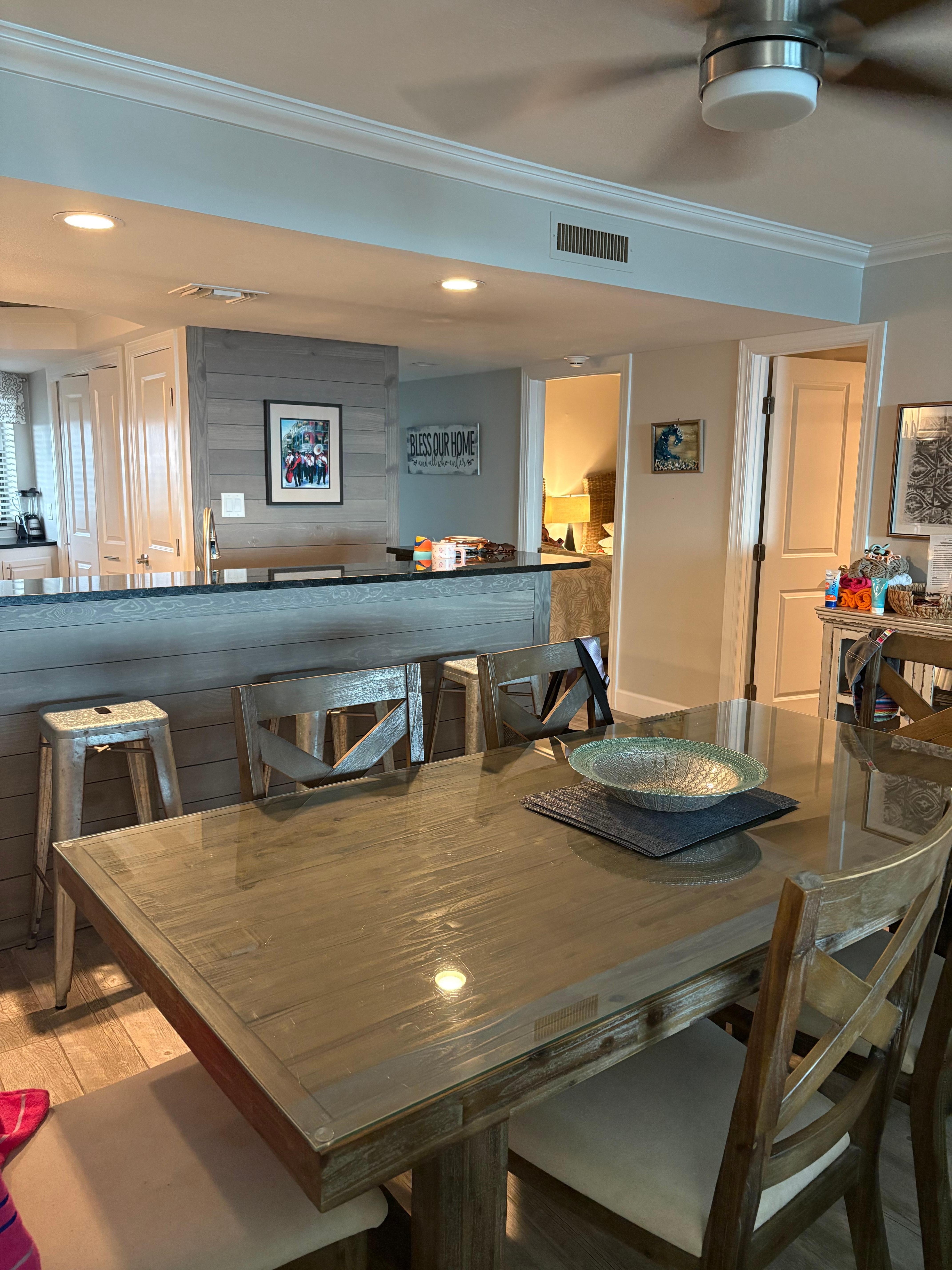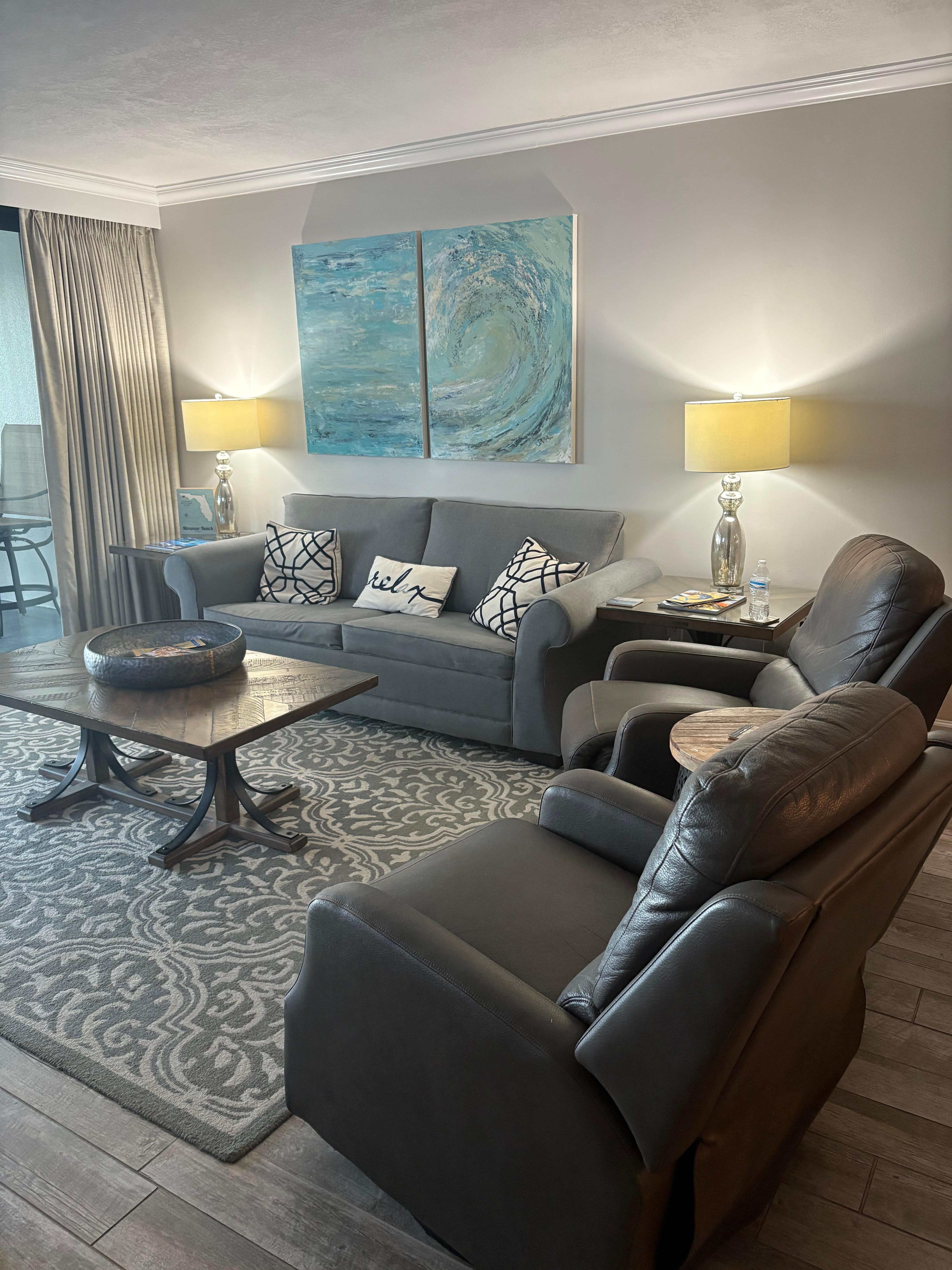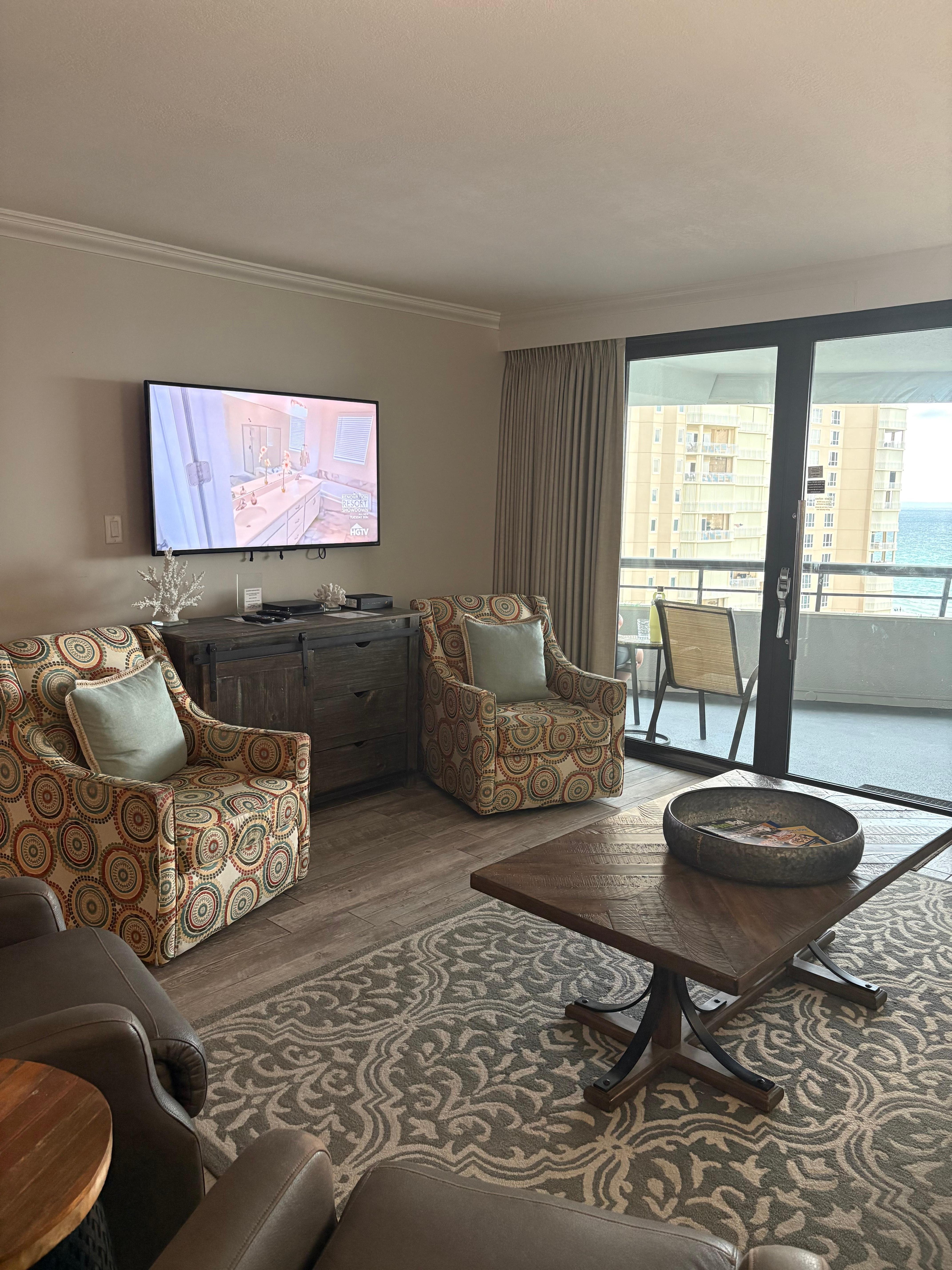 From the minute you enter this wonderful Edgewater Beach Resort and Ocean Front Vacation Condo, you will be inspired to take in the view and relax! There are floor to ceiling windows and patio access water views from the Living Room and Master Bedroom. The Kitchen opens up into the living area so everyone can visit while entertaining or preparing meals. The dining tables seats 6. The Kitchen has a full range of utensils and stainless appliances. Black out drapes make sleeping cozy for anyone sleeping on the sleeper sofa or master bed. Spacious Balcony with room for everyone. Great for Families, Girls Getaways, Golf Trips and Couples Getaways. With perfect sunrise views and shady afternoons on the balcony, this unit is EVERYTHING a Vacation Rental should be - The Perfect Place to Get Away, Relax, and Make Memories!