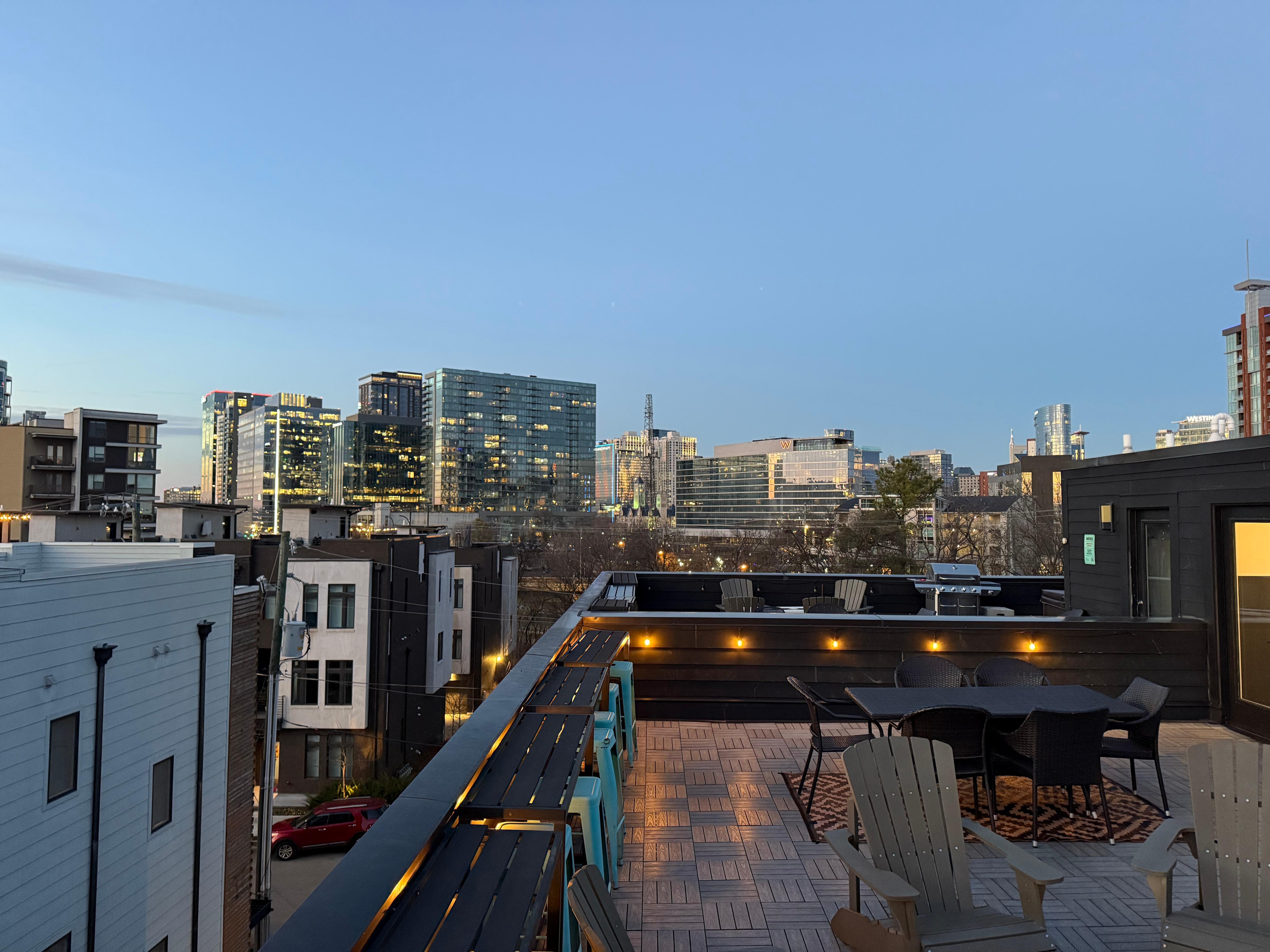 The rooftops are the reason this home is in such high demand. The star of the show is definitely the private hot tub on the rooftop with panoramic skyline views of Nashville. There's also a gas fire pit and grill as well as plenty of seating for everyone to relax and have a good time.