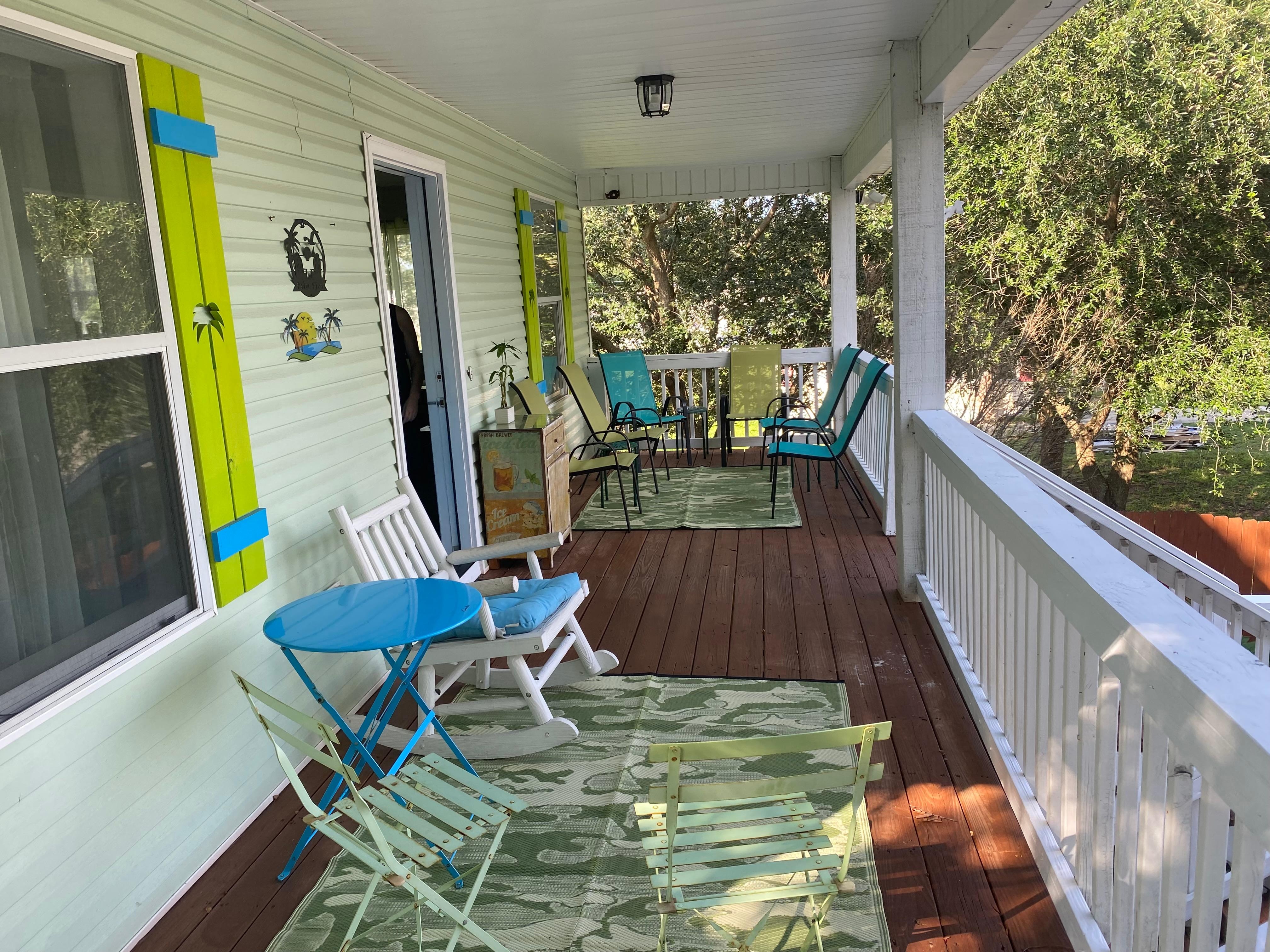 PORCH AND PATIO: Large front porch has view of Gulf, plenty of seating to enjoy the ocean breeze. Huge patio under the house on ground level has picnic table, bar, hammock, cocktail table, corn hole game, yard croquet game, more.