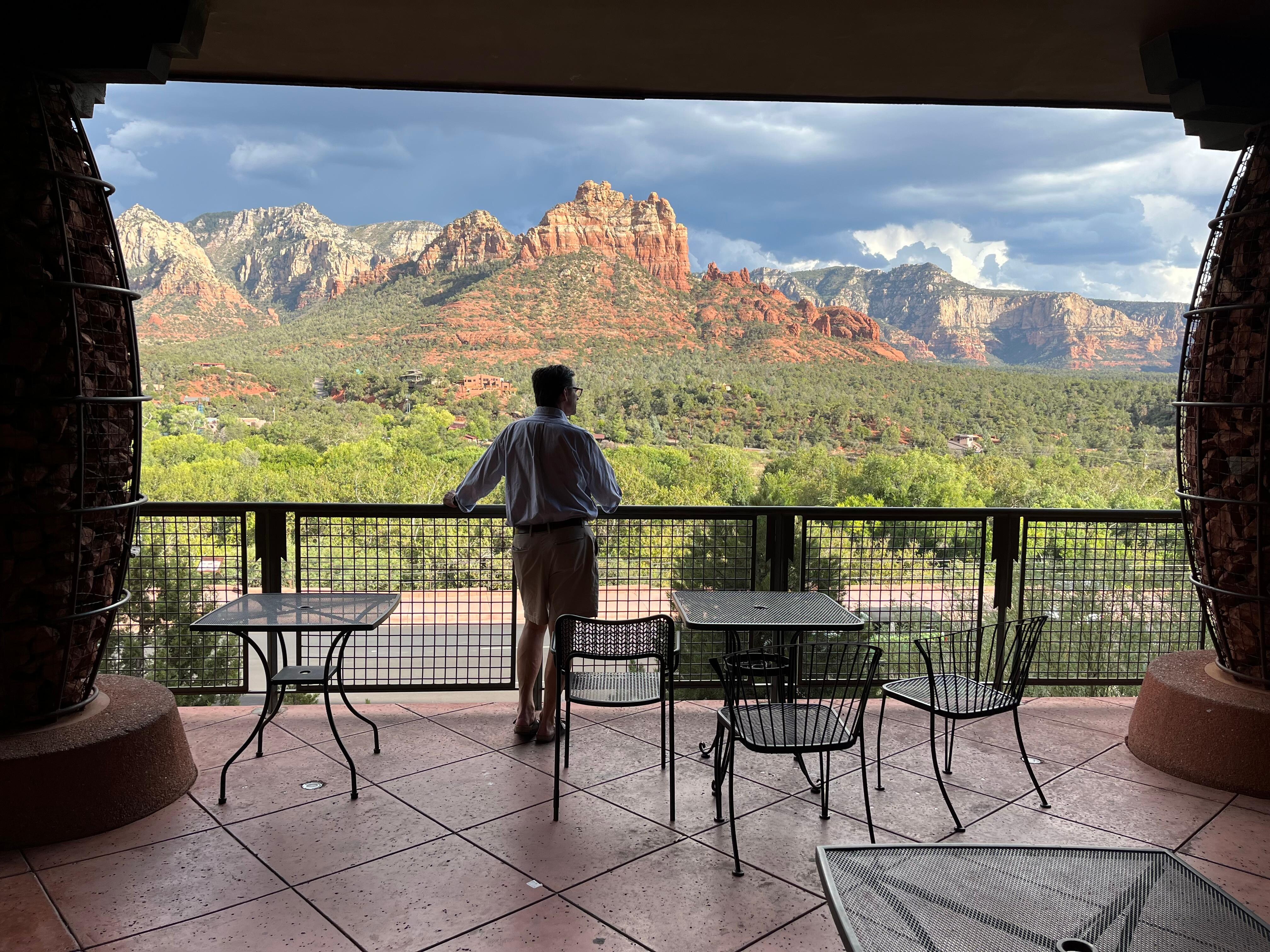 After you settle in, you will want to go onto the front east facing outdoor patio to gaze & enjoy views of Giants Thumb, Snoopy Rock, The King & Three Queens formation, Steamboat Rock and the spectacular views of Wilson Mountain. A fantastic spot to meditate, listen to nature, have a quite morning breakfast or an afternoon beverage.