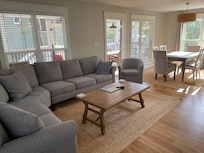 Inside, the open-concept living space is bathed in natural light, with high end finishes, stylish furnishings, and coastal-chic décor. A wraparound dove-gray couch and regal accent chair provide a cozy spot for gathering in the living area, where a large wall-mounted flatscreen TV invites movie nights and unwinding after a sun-soaked day. The dining space features a mix of cottage-style and woven chairs around a sleek modern table, perfect for shared meals. The chef's kitchen boasts custom light teal cabinetry, quartz countertops, a glass-brick backsplash, and brushed stainless steel appliances, including a French-style refrigerator, making meal prep effortless. Multiple covered verandas and a screened-in porch provide shaded outdoor seating for morning coffee, evening cocktails, or alfresco dining.