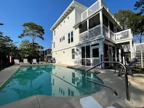 Step outside to discover your own private backyard oasis. The sparkling swimming pool, illuminated beautifully at night, provides the perfect escape after a day at the beach. A screened-in porch and two covered verandas offer shaded spots to relax, whether you're reading a book, sipping a cocktail, or enjoying the Gulf breeze. Fire up the gas grill for a poolside cookout—the perfect way to end a sun-drenched day along 30A.