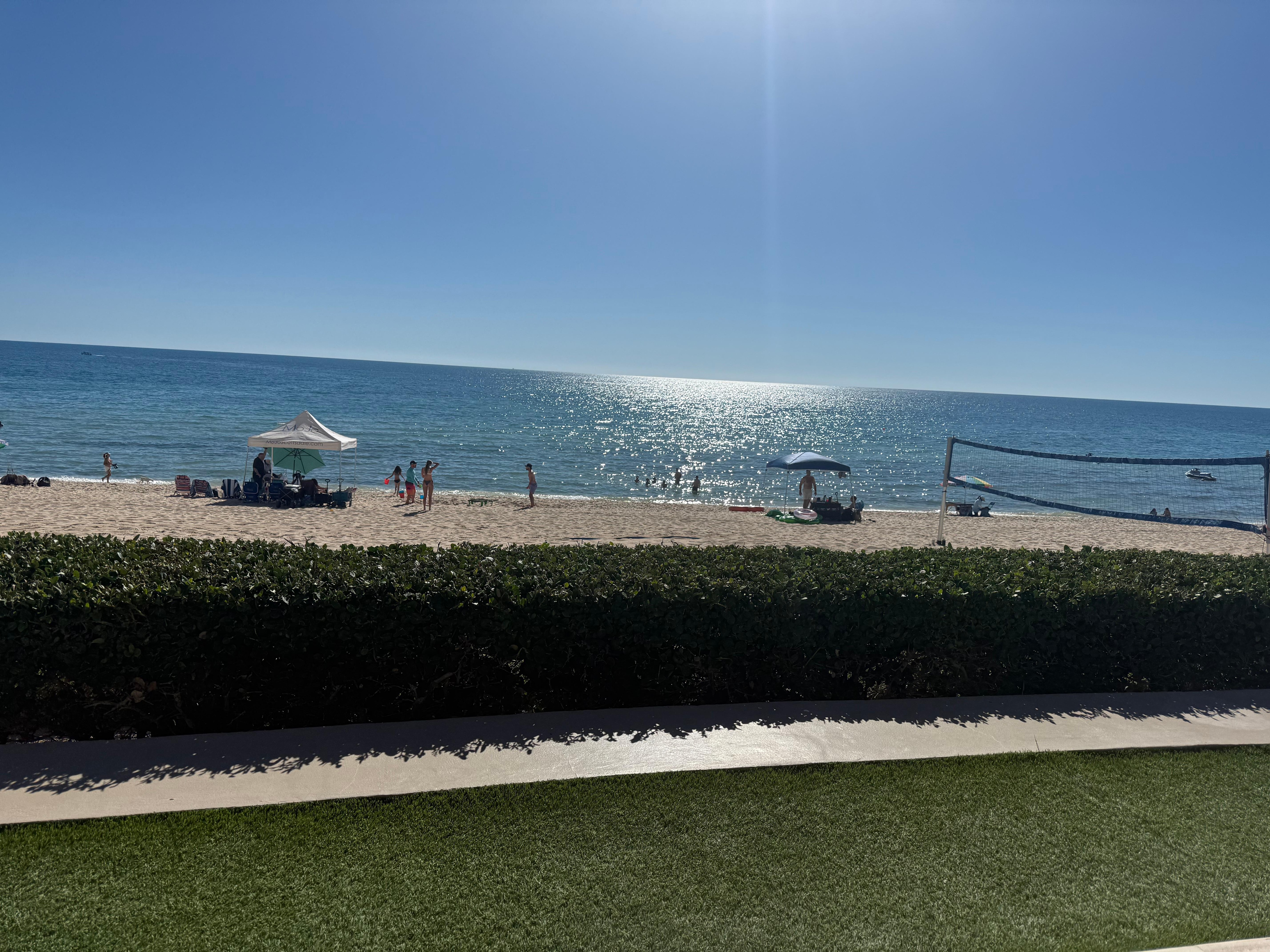The patio is nicely decorated with high end patio furniture with seating for 9 and has incredible views of the beach, ocean, and resort pools.